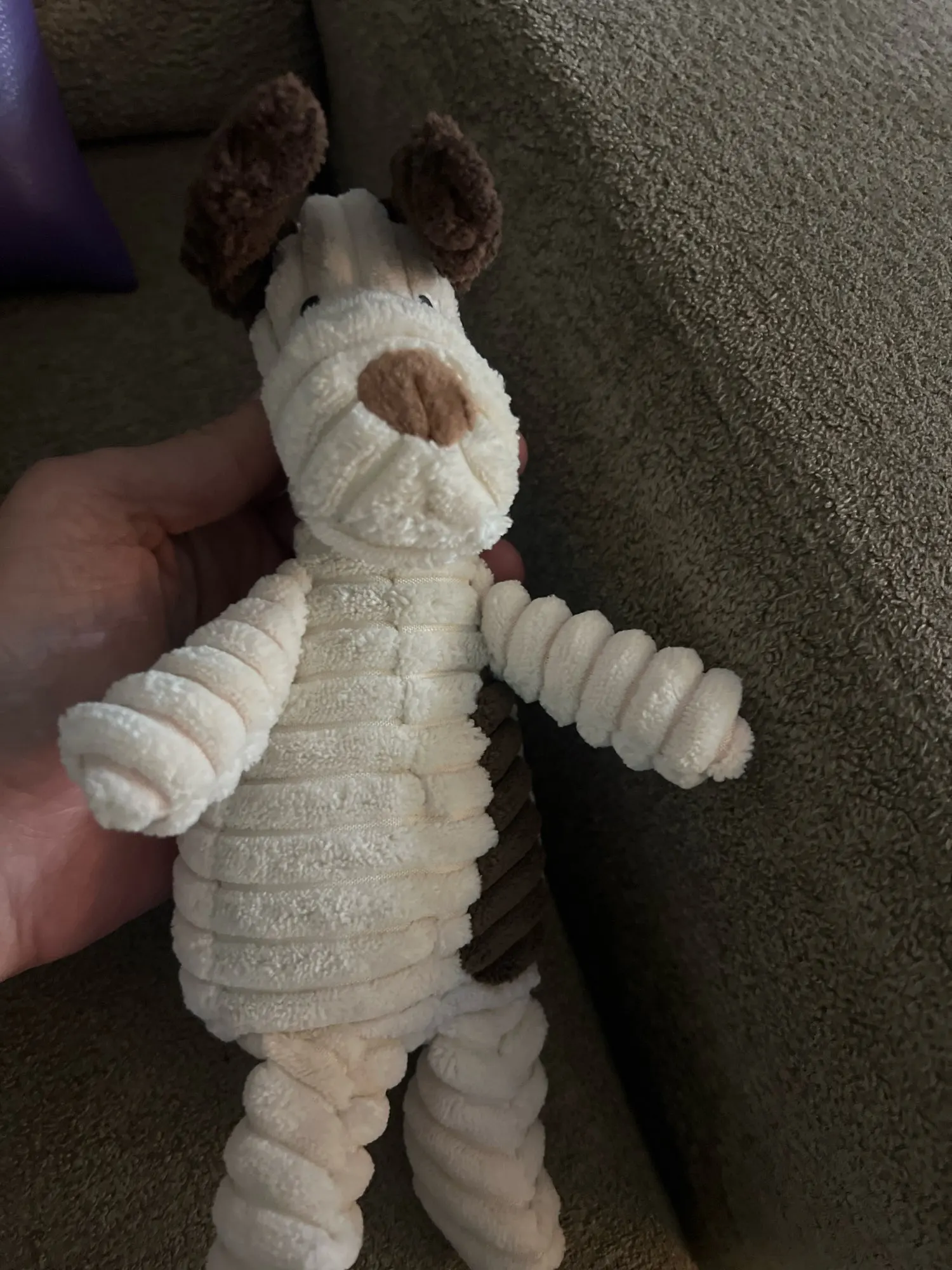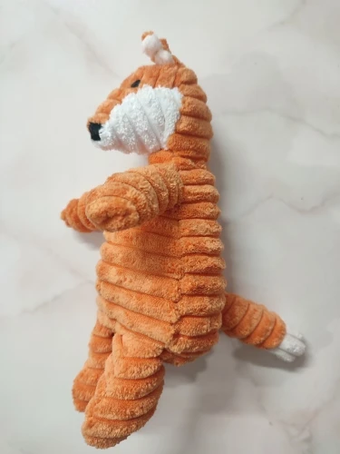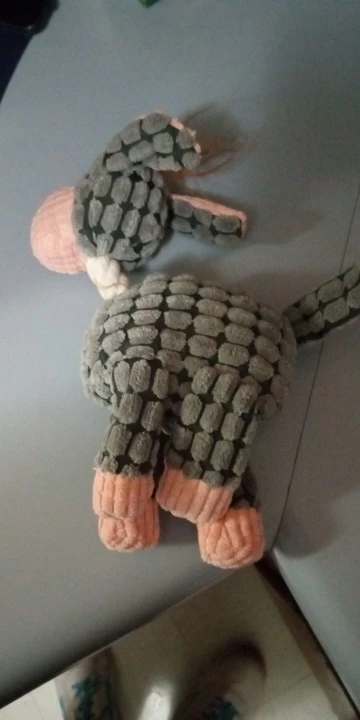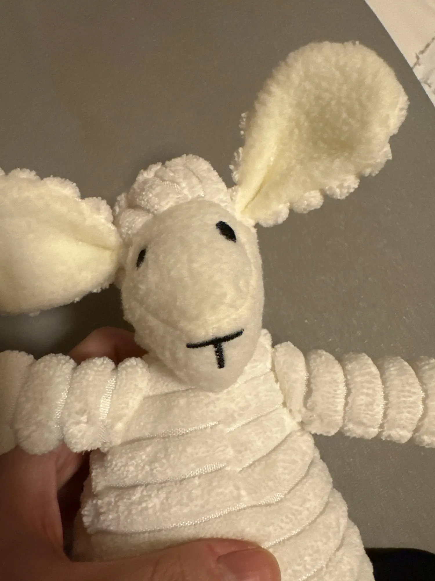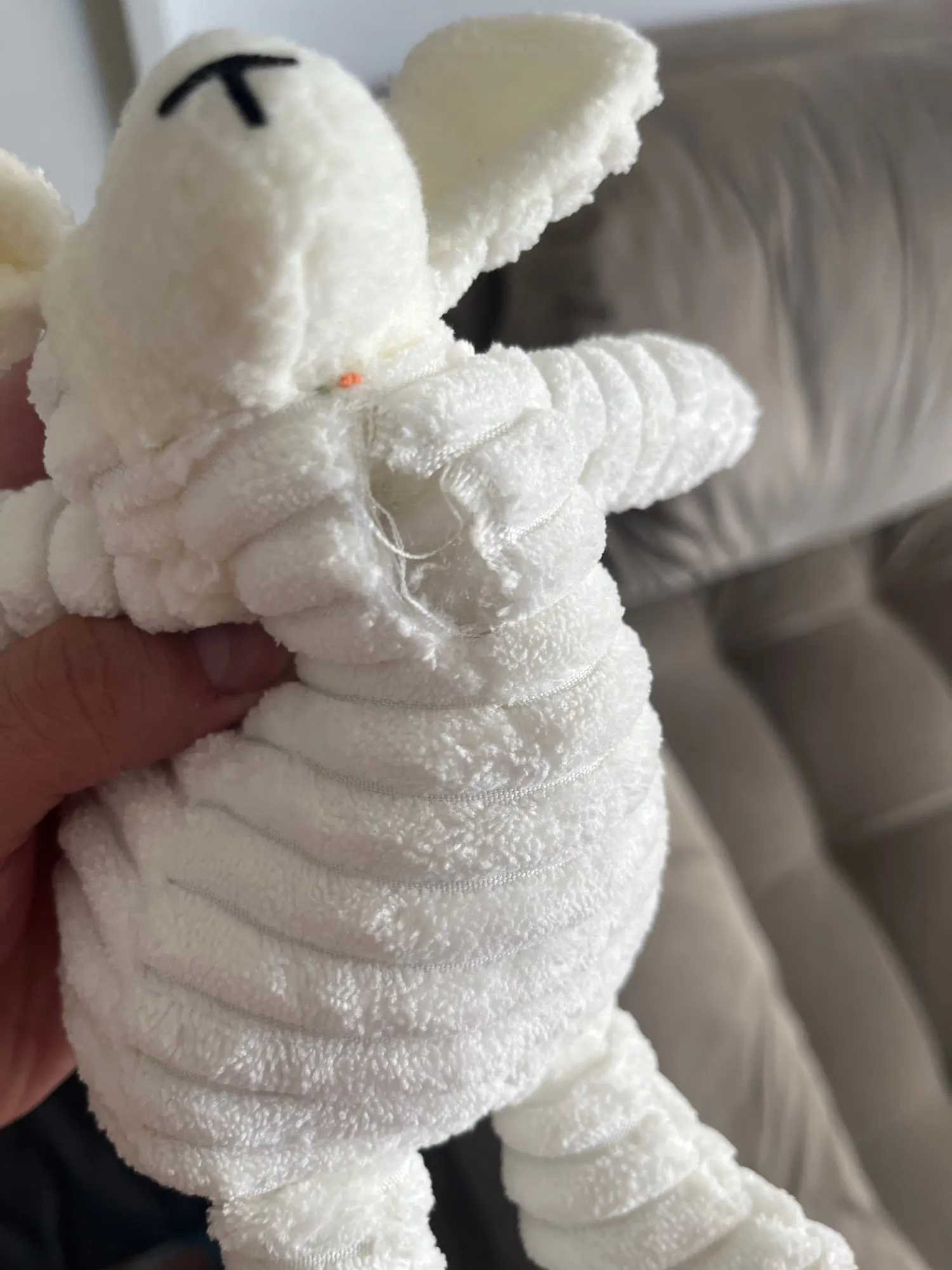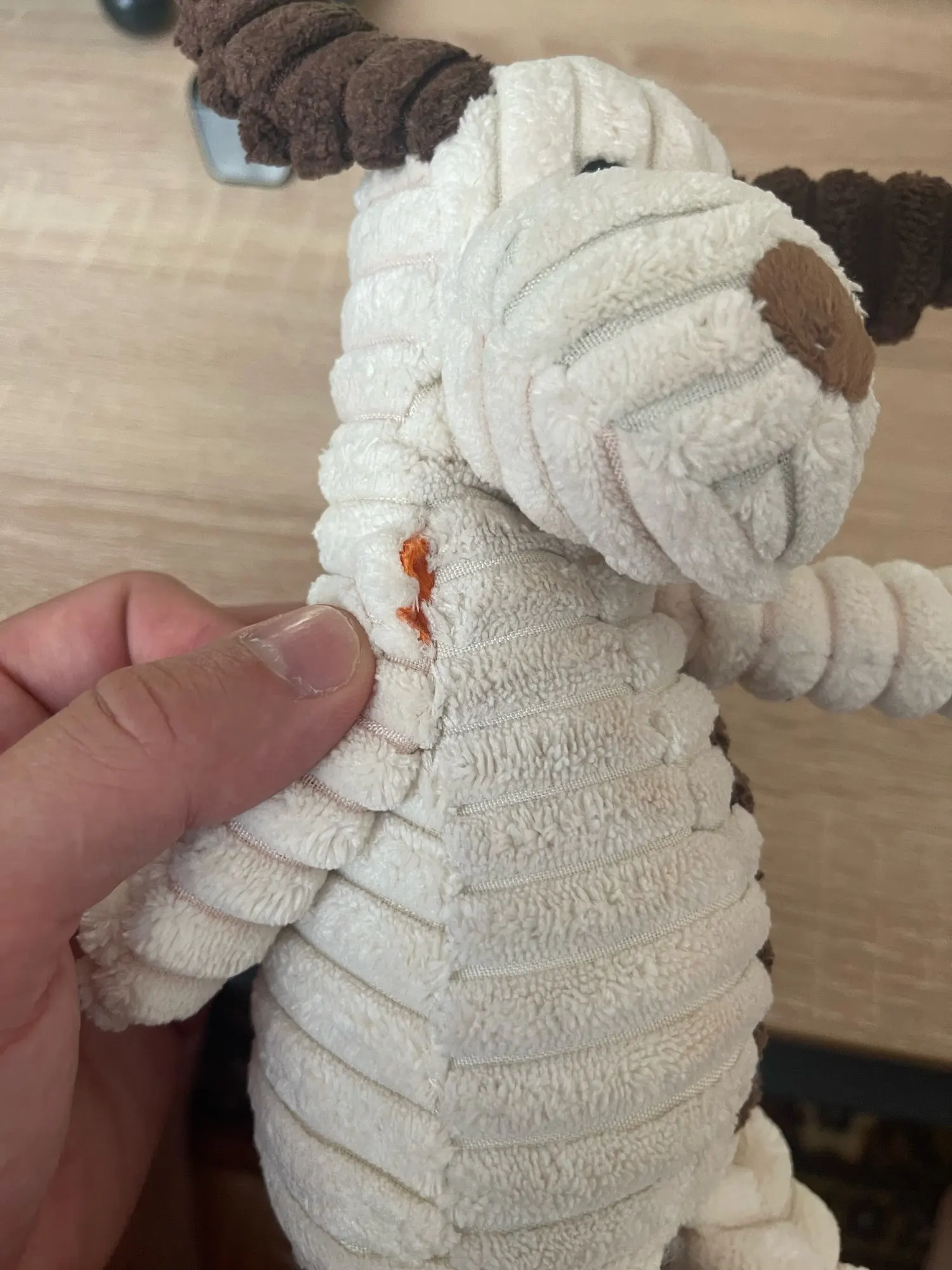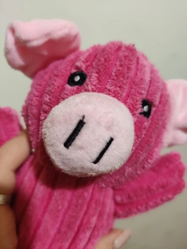 This toy looks defected. The face is very long and doesn’t look like the picture at all the eyes are thread and sewn instead of buttons. The head is badly sewn and out of shape. Very long face instead of a cute one. The squeaker works so if it’s for your dog it’s fine.