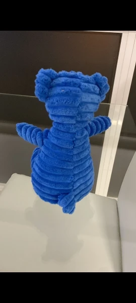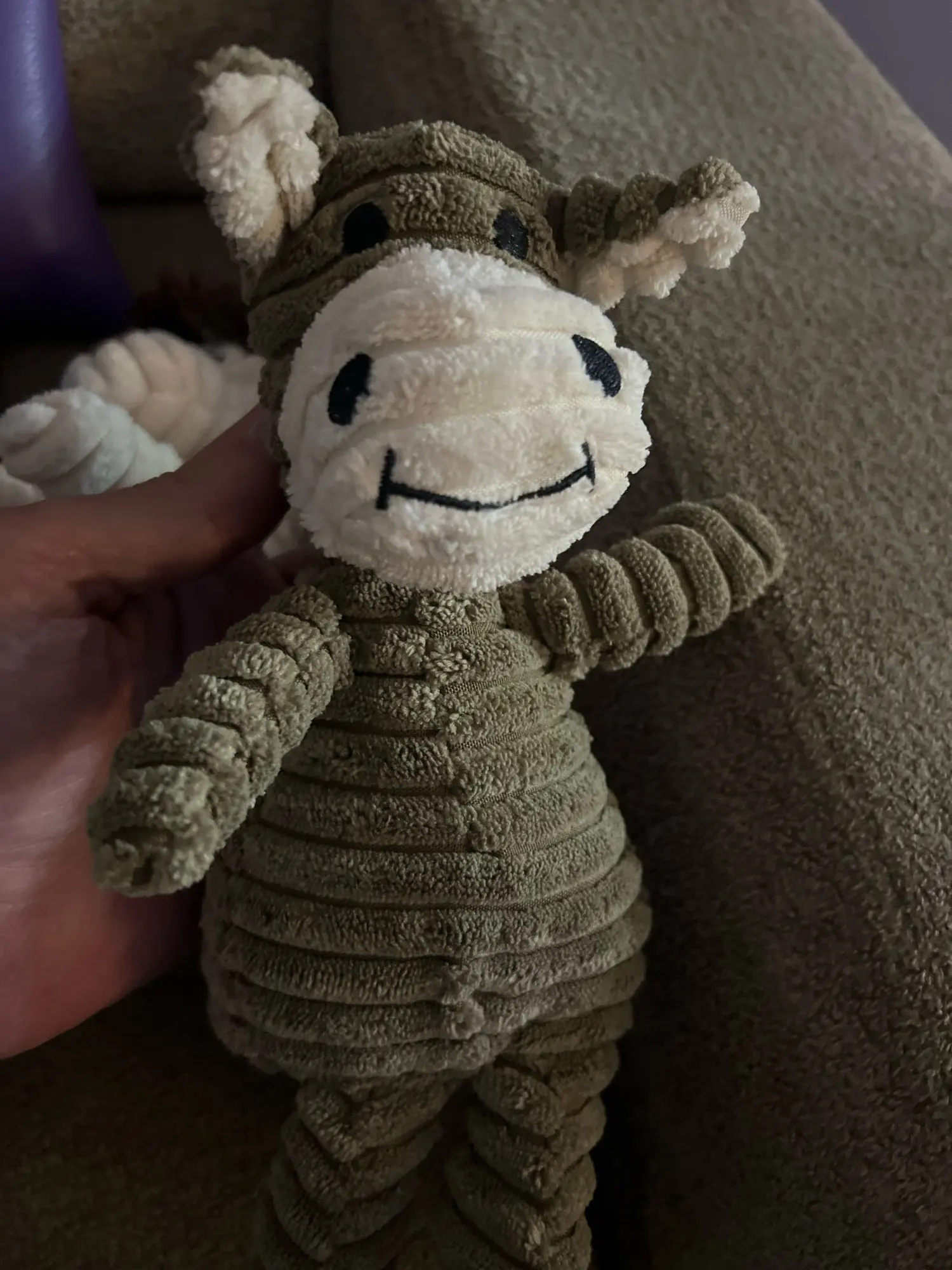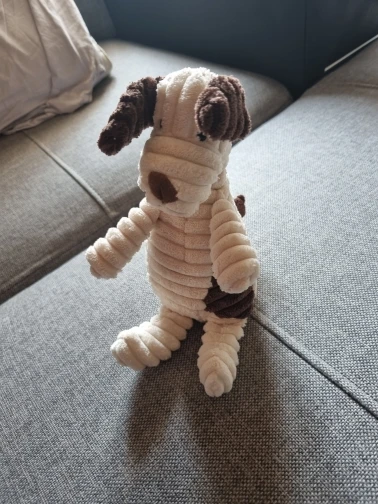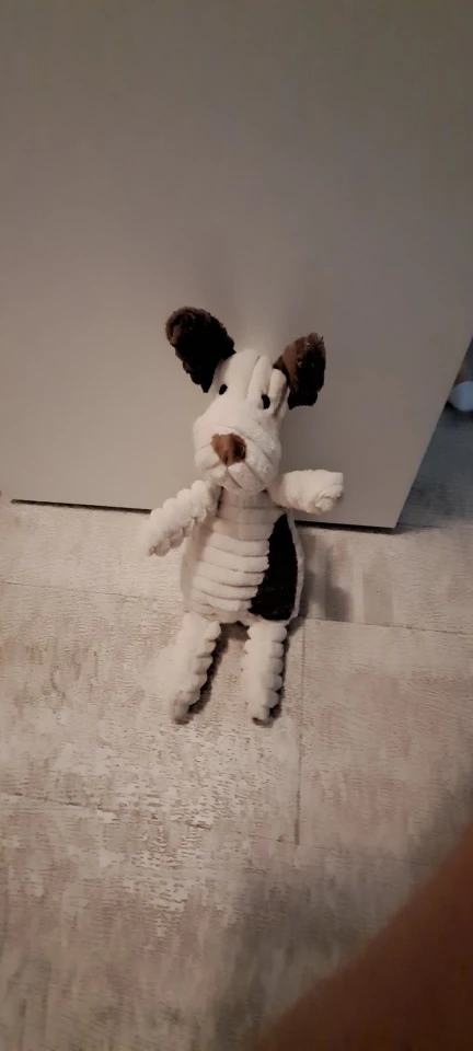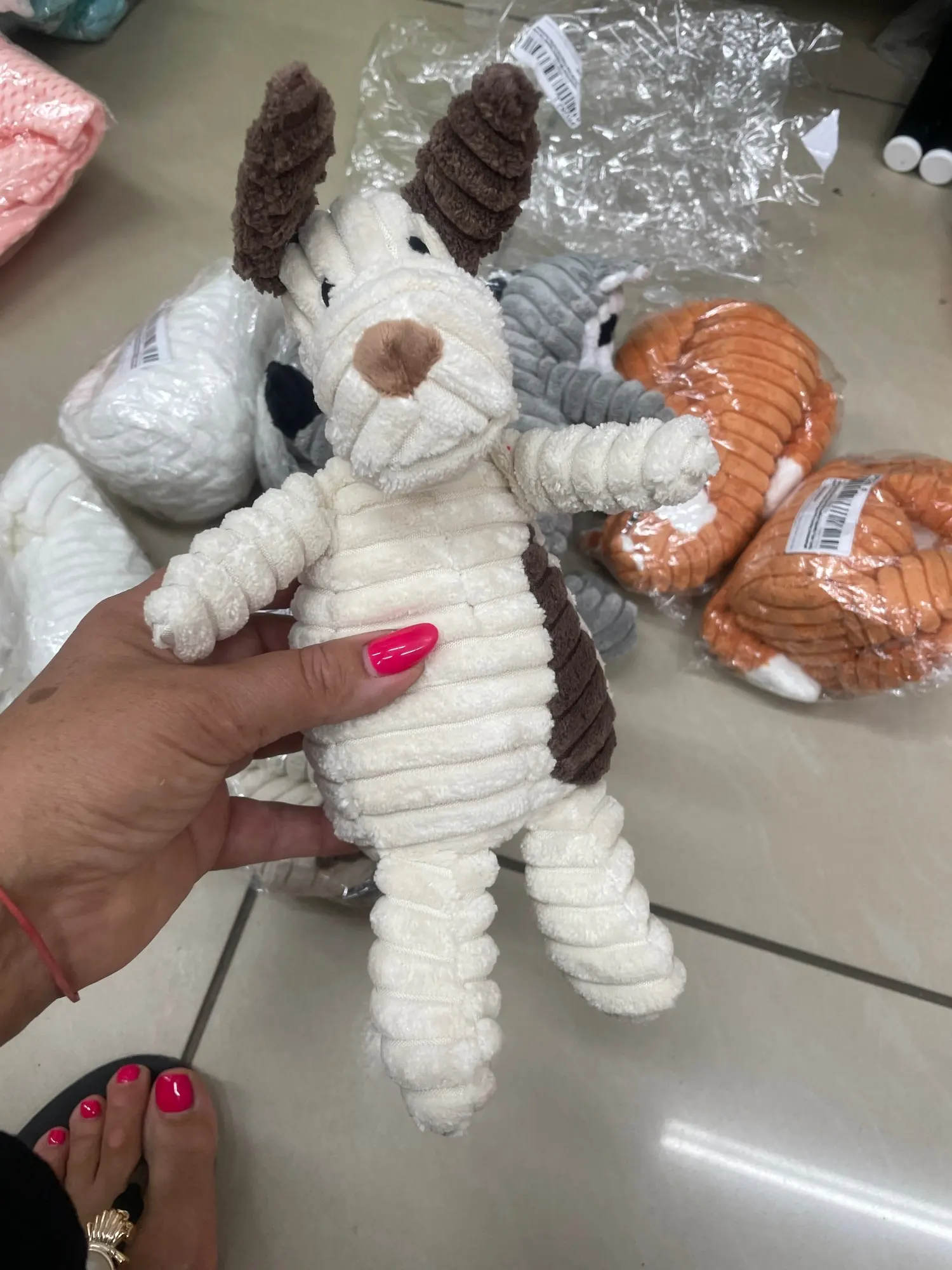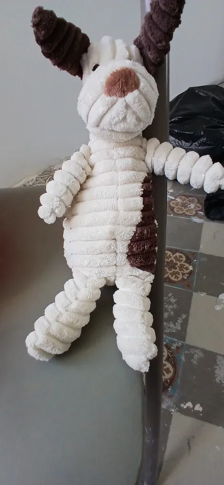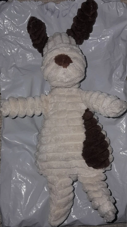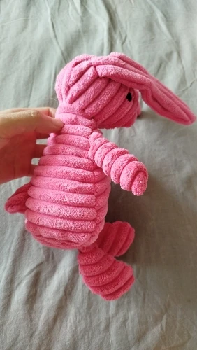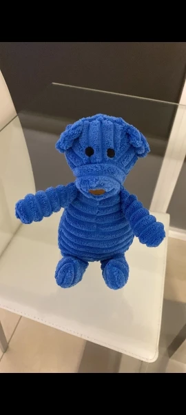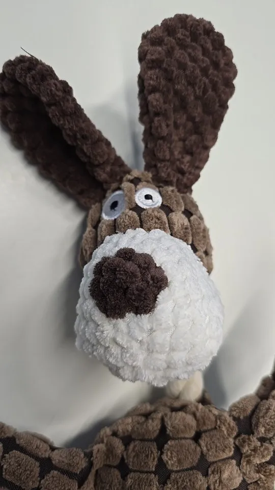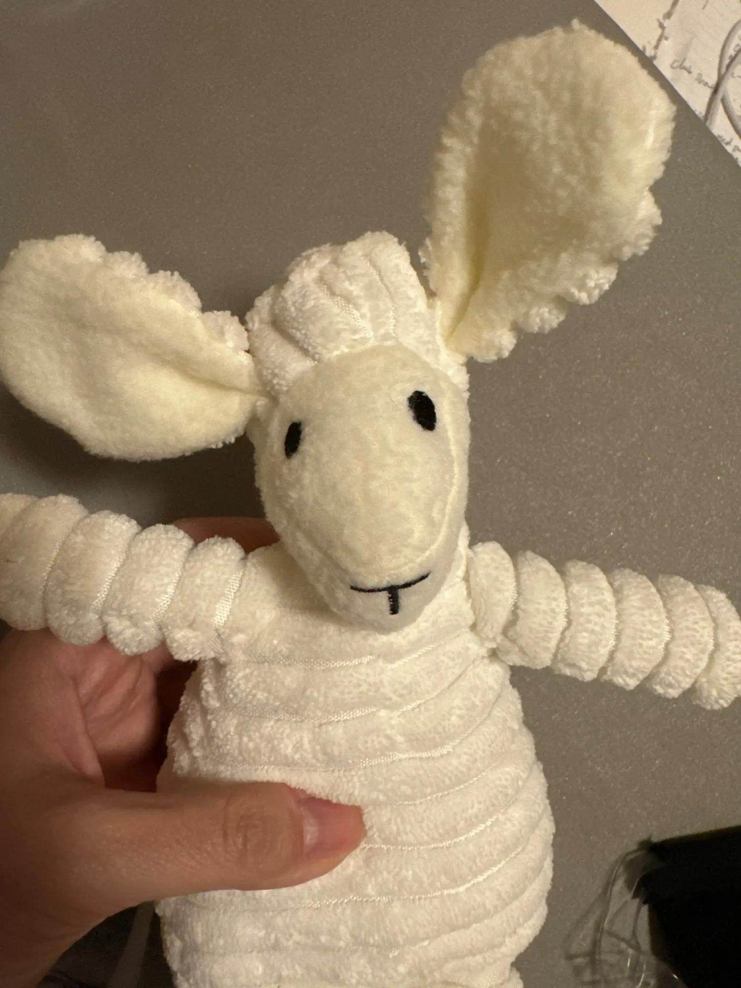 This toy looks defected. The face is very long and doesn’t look like the picture at all the eyes are thread and sewn instead of buttons. The head is badly sewn and out of shape. Very long face instead of a cute one. The squeaker works so if it’s for your dog it’s fine.