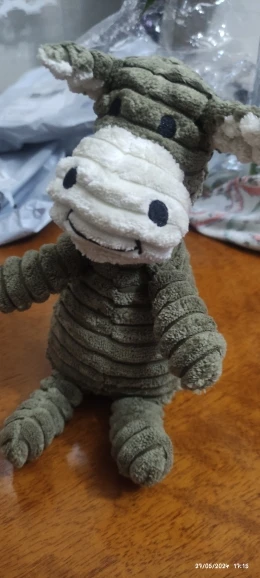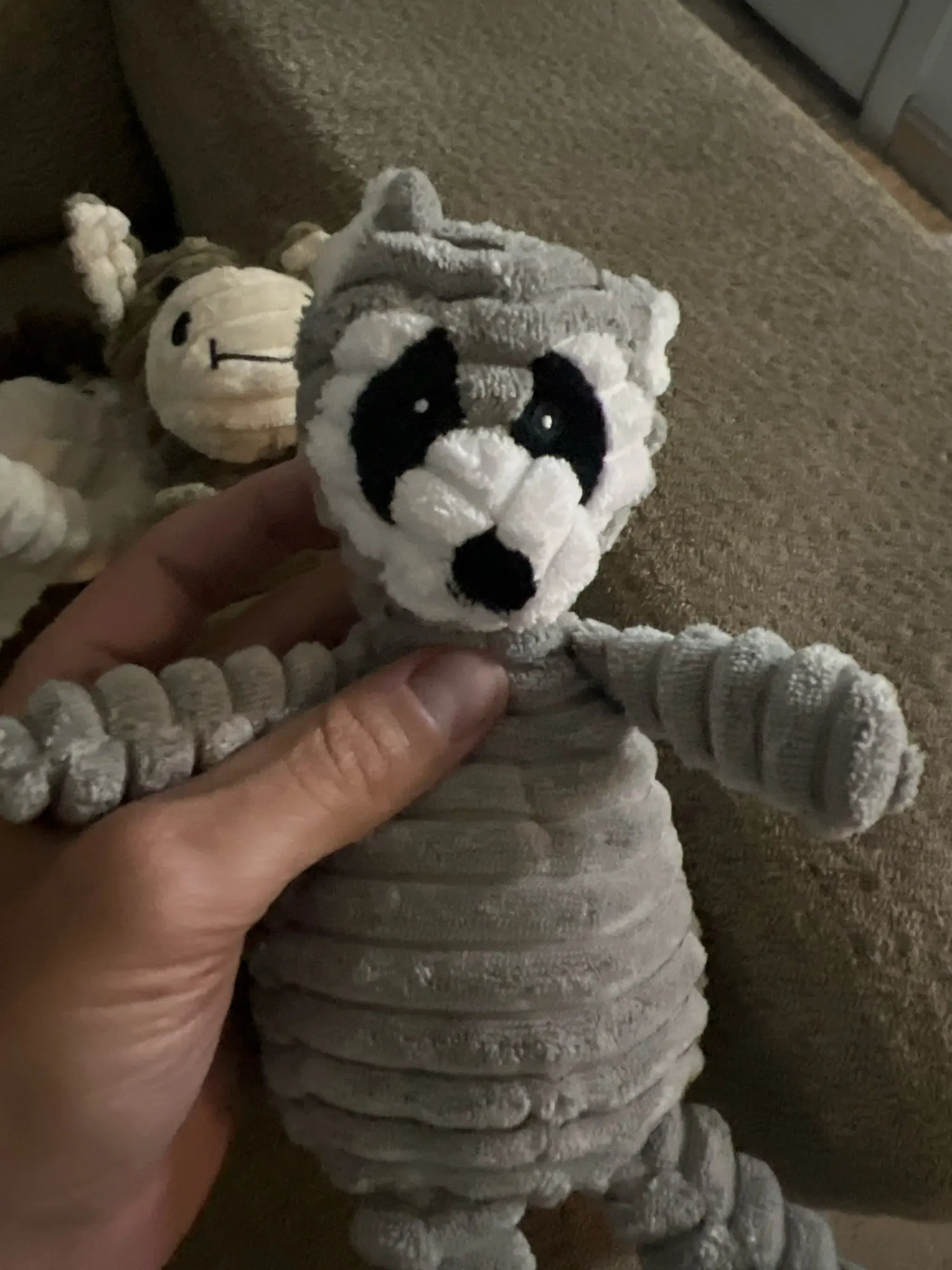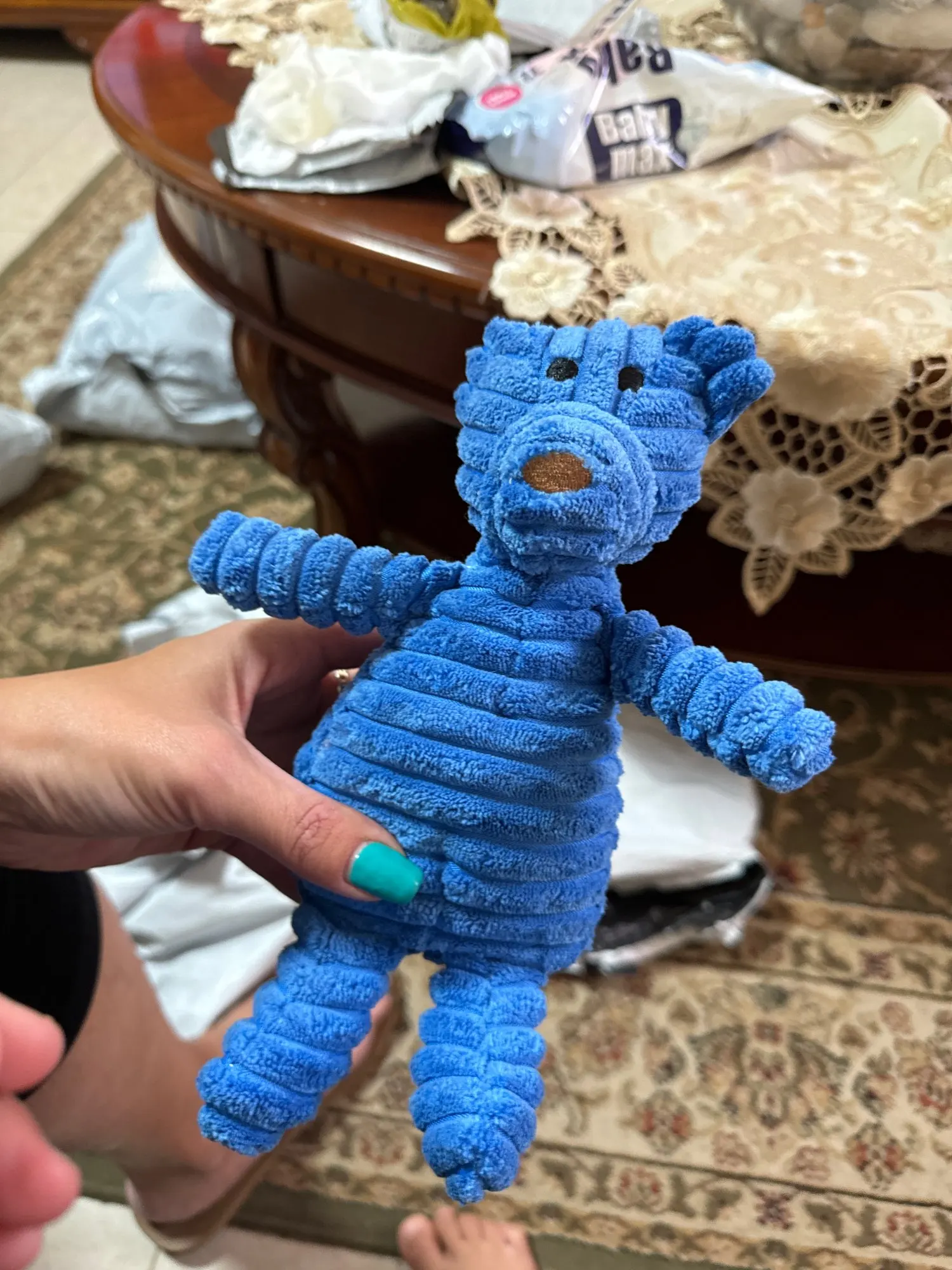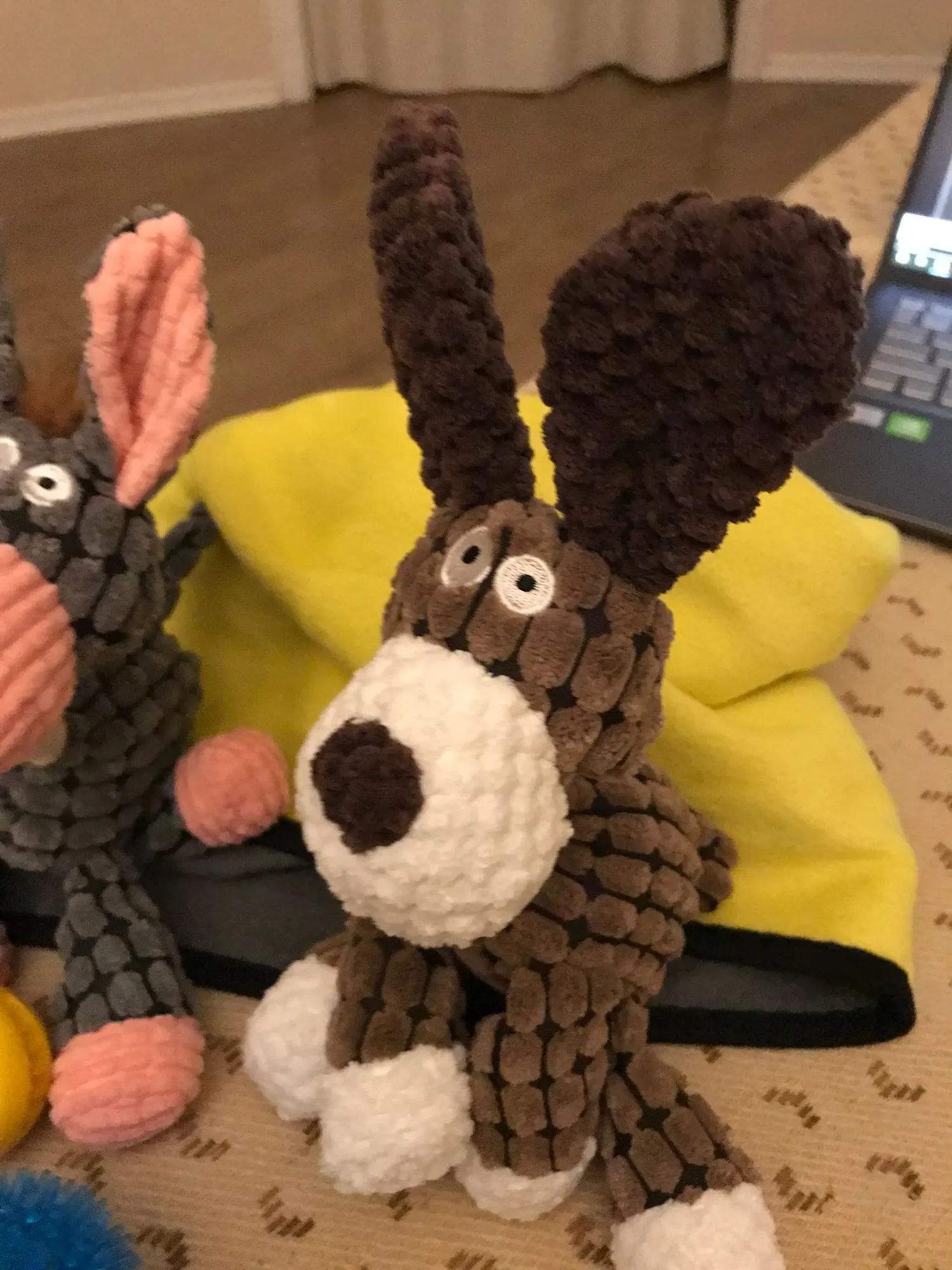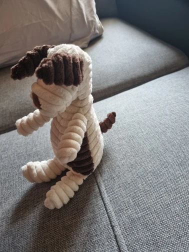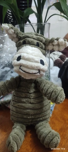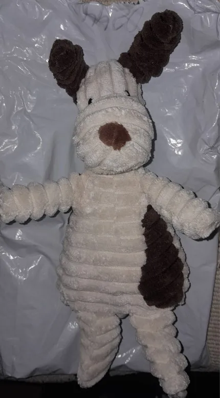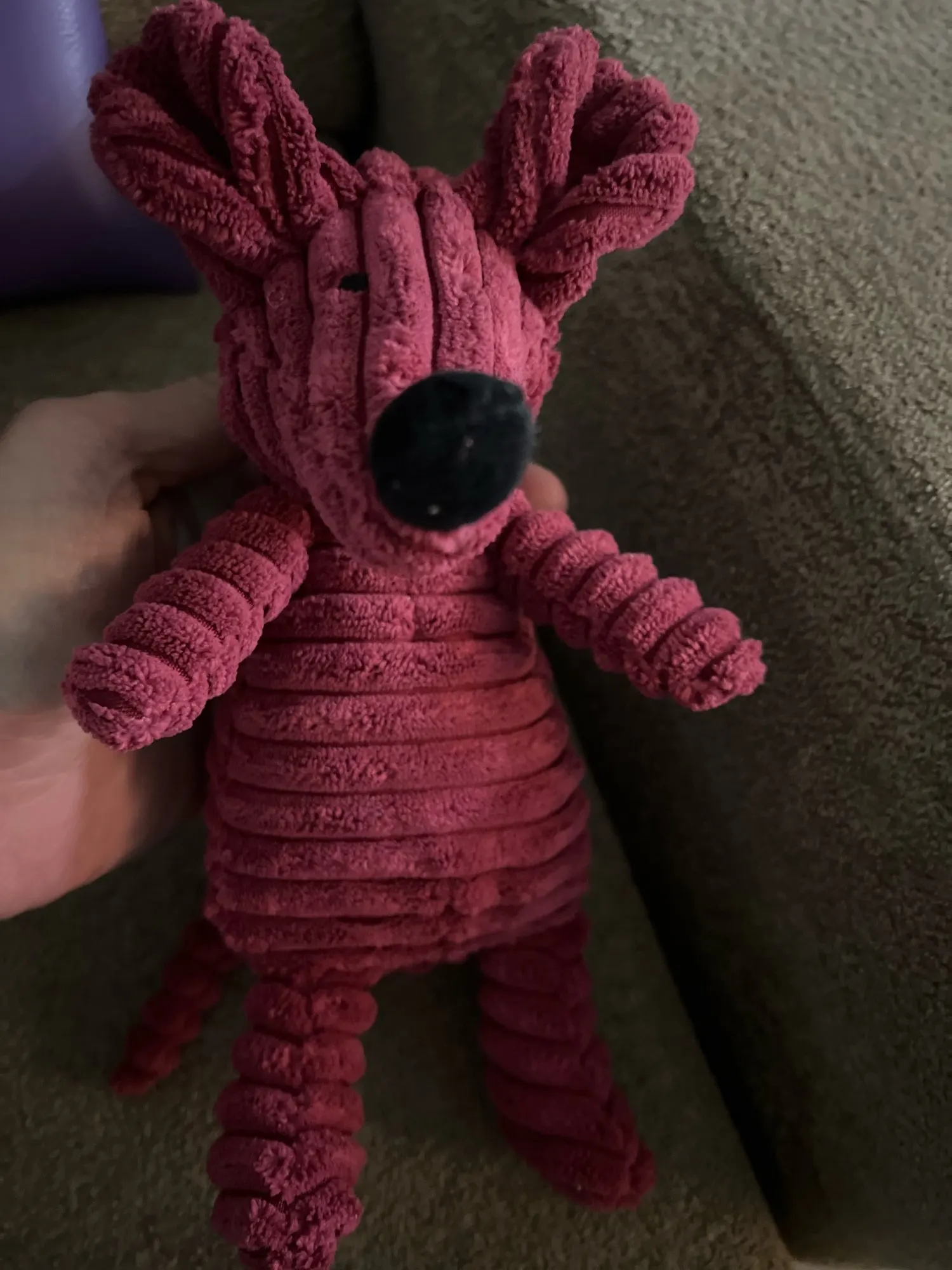 This toy looks defected. The face is very long and doesn’t look like the picture at all the eyes are thread and sewn instead of buttons. The head is badly sewn and out of shape. Very long face instead of a cute one. The squeaker works so if it’s for your dog it’s fine.