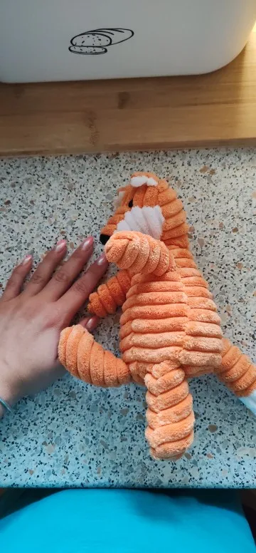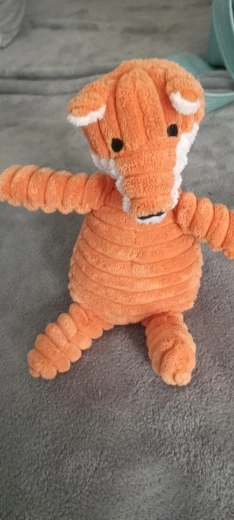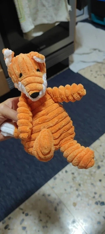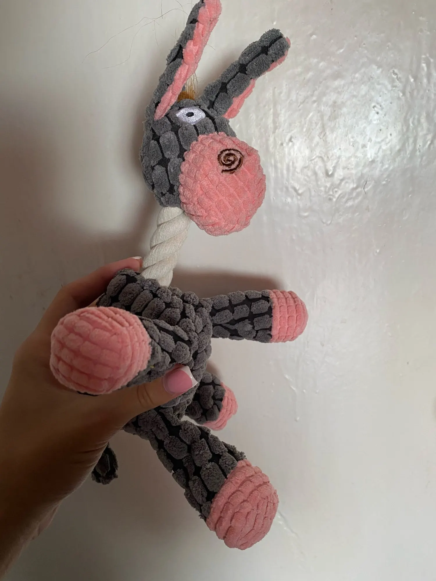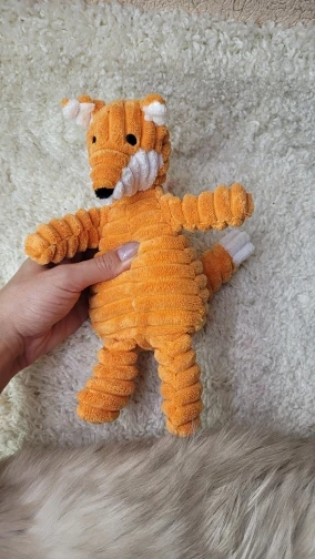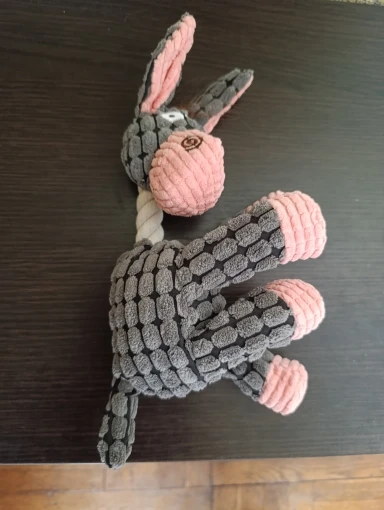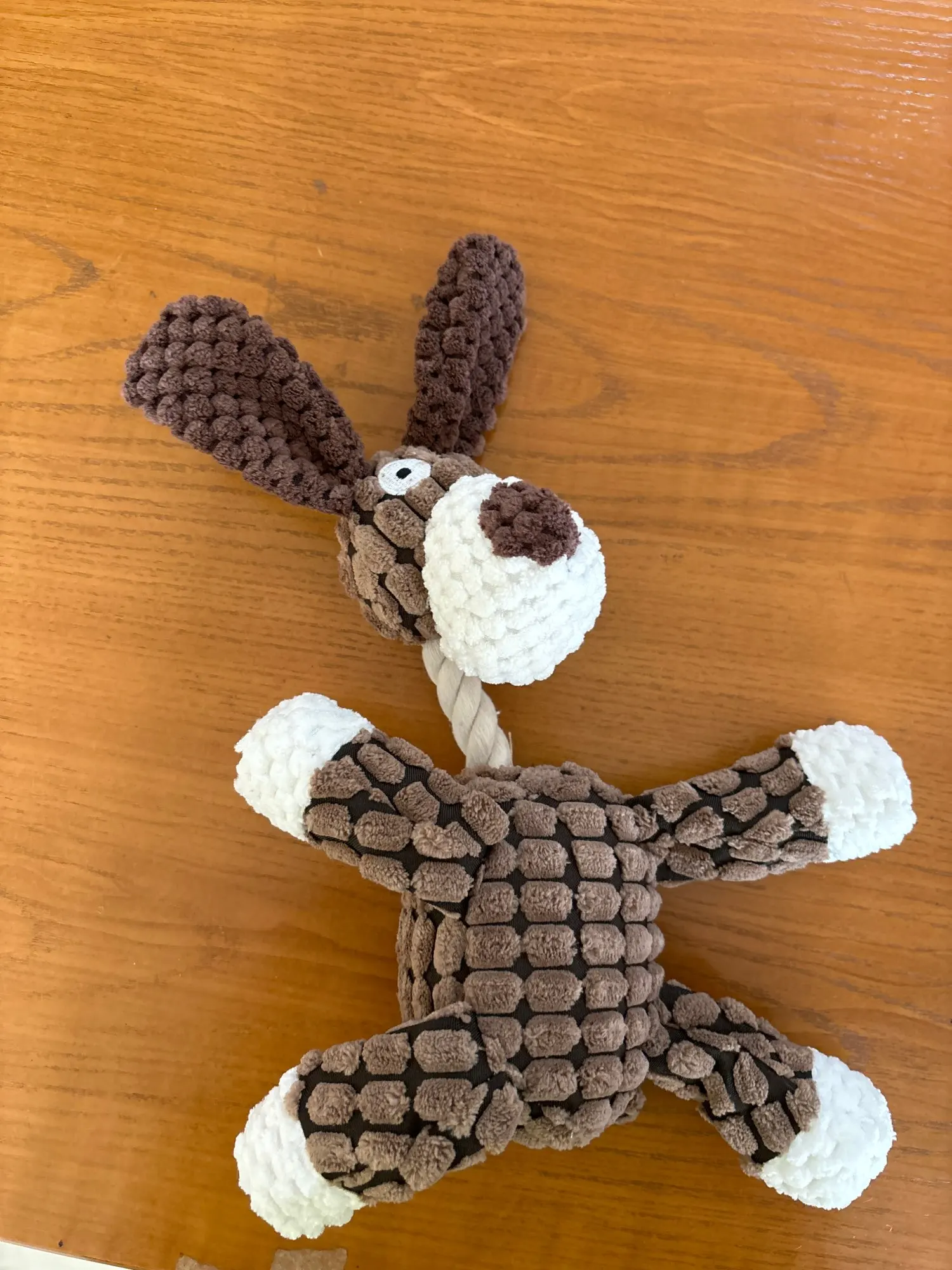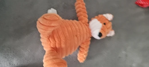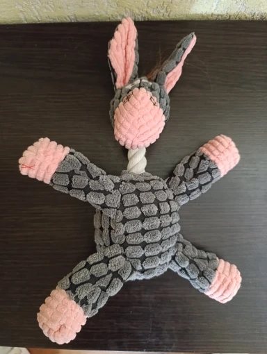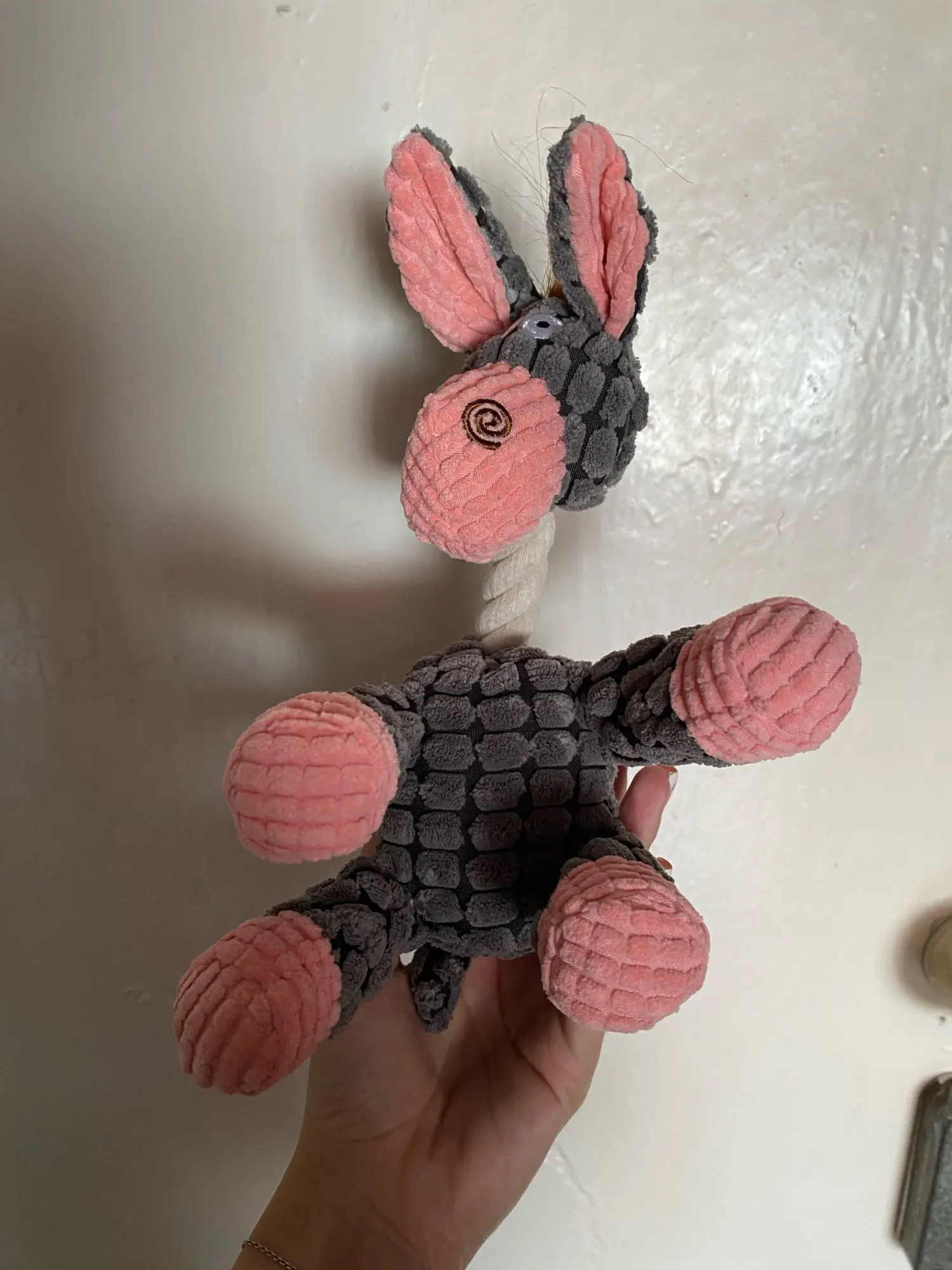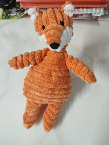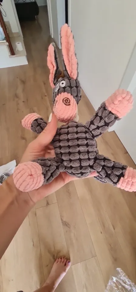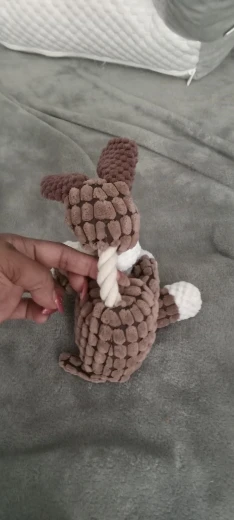 This is an adorable little toy. My squeaker doesn’t work very well but I still like it. My daughter’s furbabies are gonna love it. It is a soft toy but the head is held on with a rope for the dogs to chew on or to play tug of war. Really cute toy.