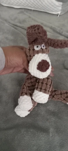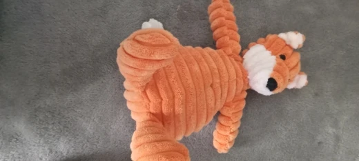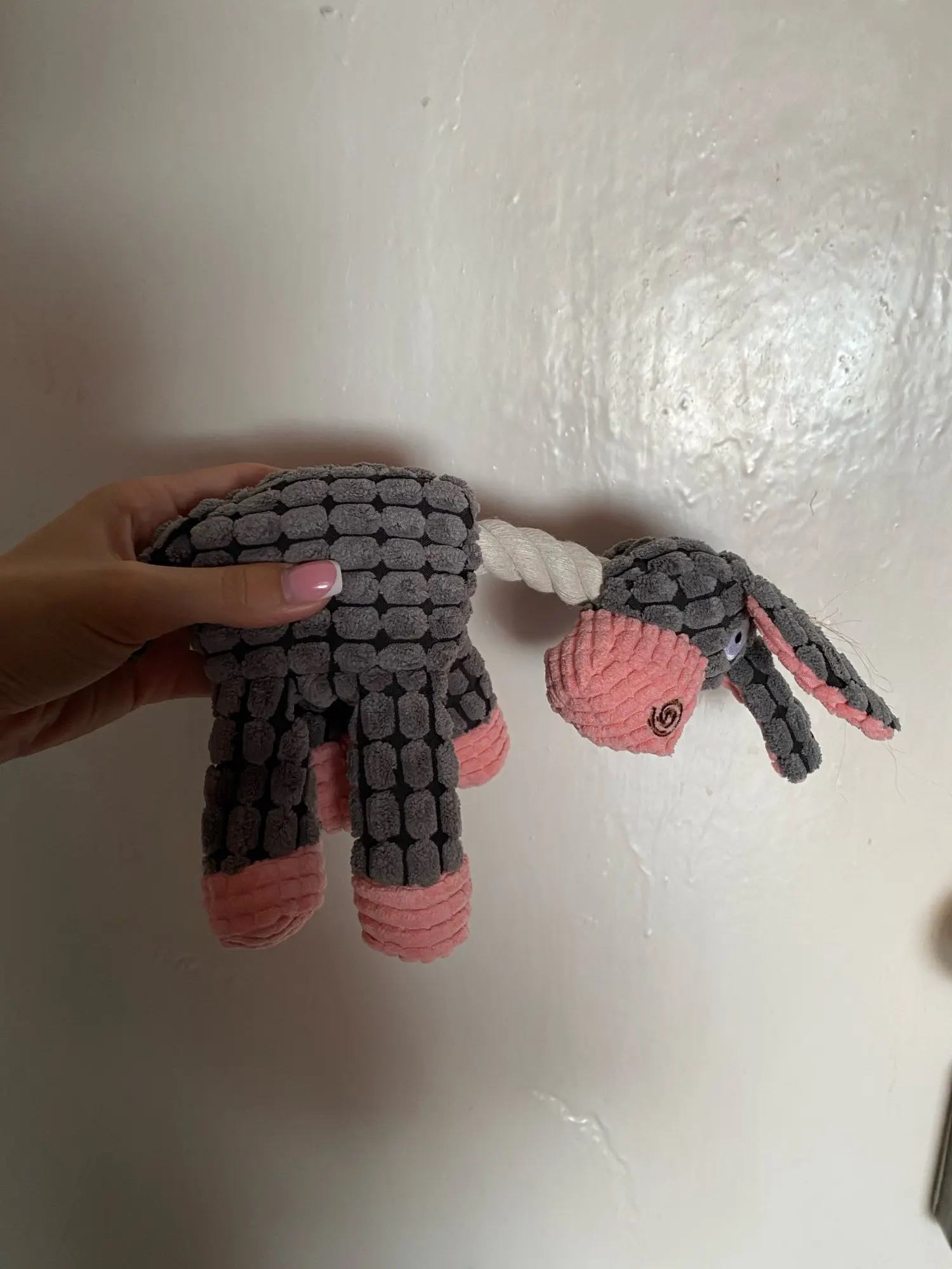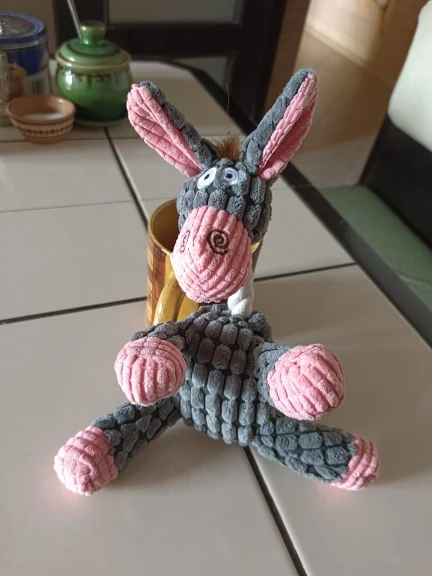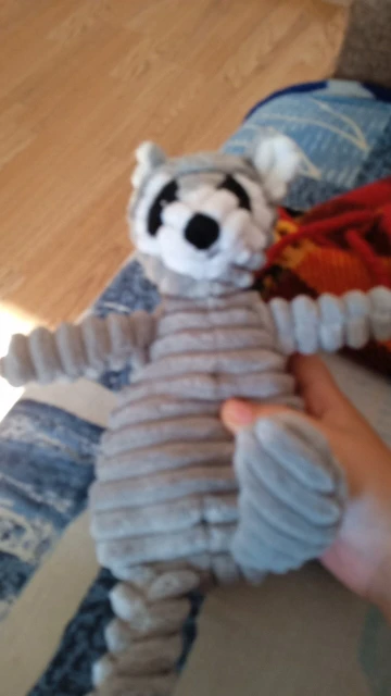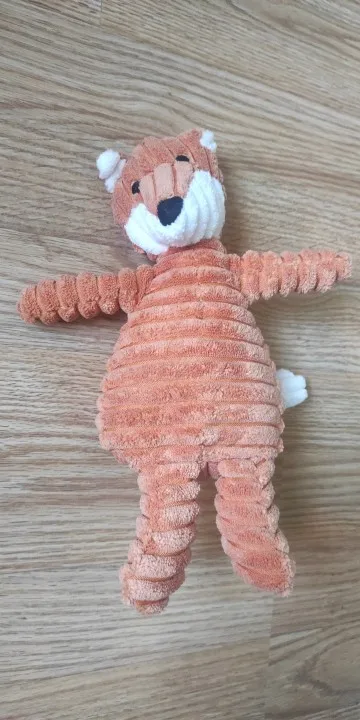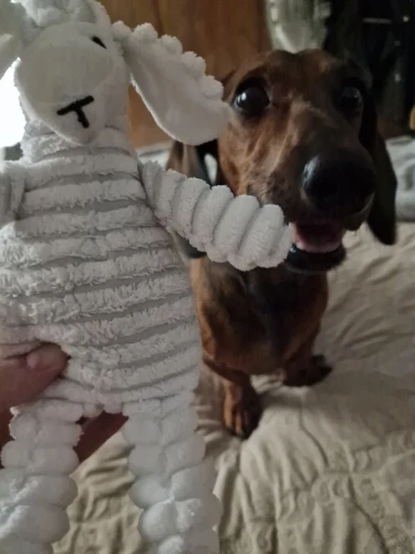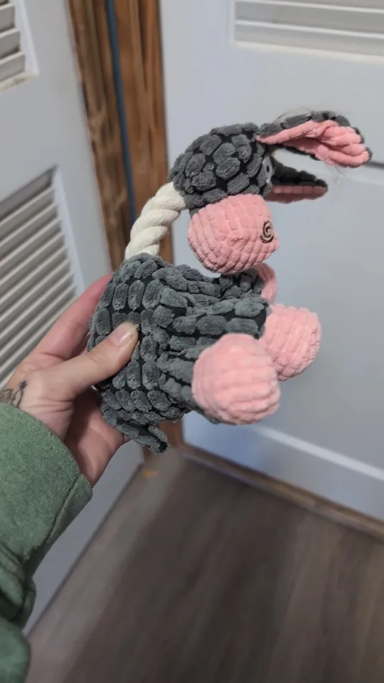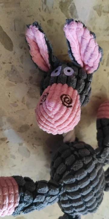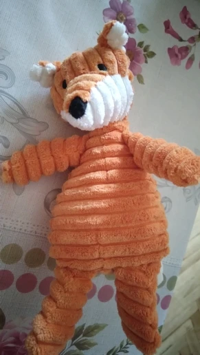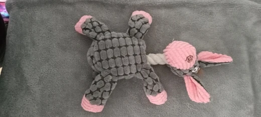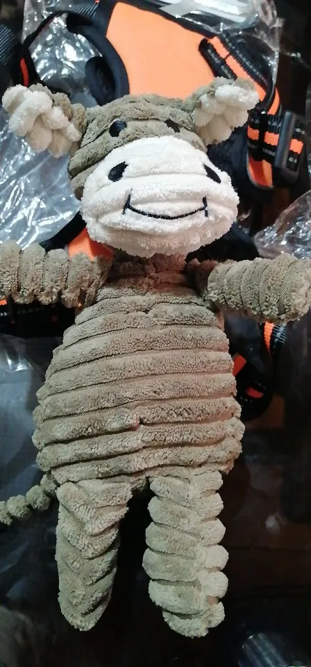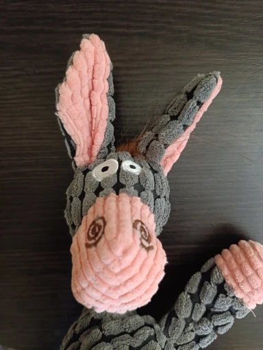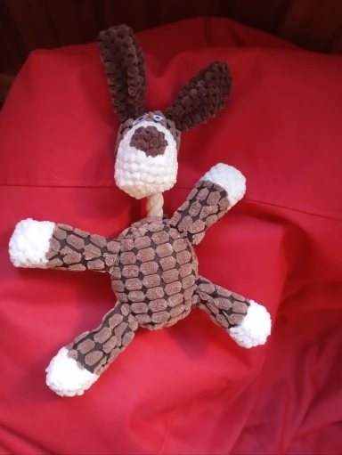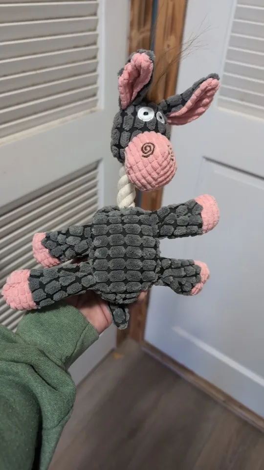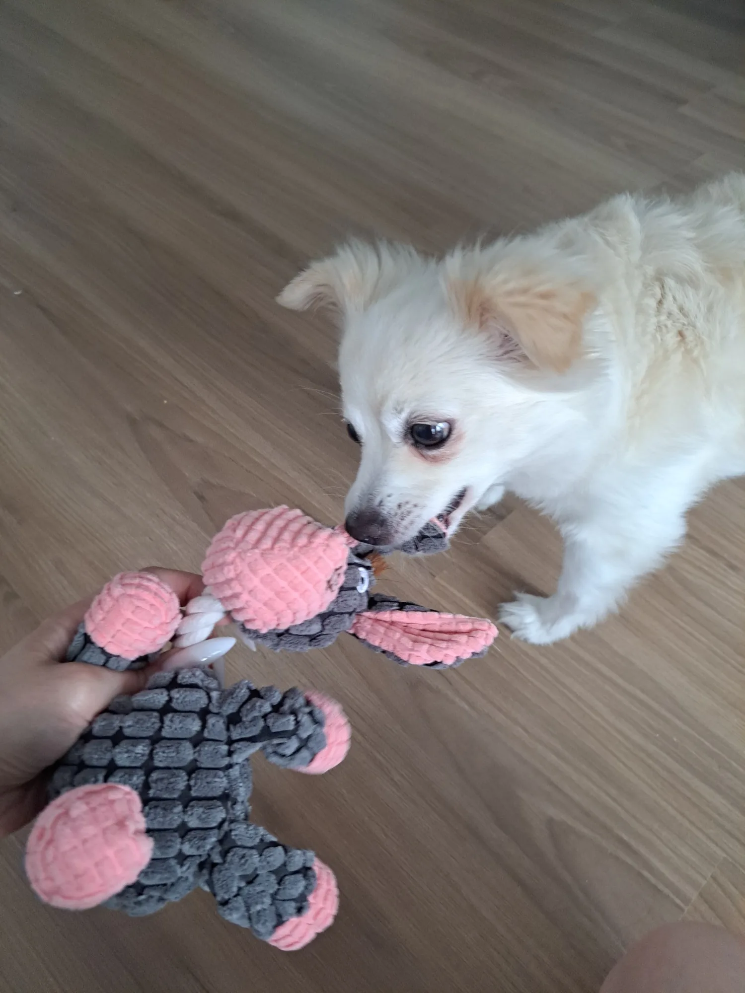 This is an adorable little toy. My squeaker doesn’t work very well but I still like it. My daughter’s furbabies are gonna love it. It is a soft toy but the head is held on with a rope for the dogs to chew on or to play tug of war. Really cute toy.