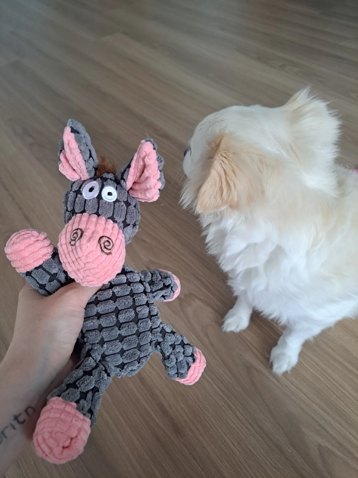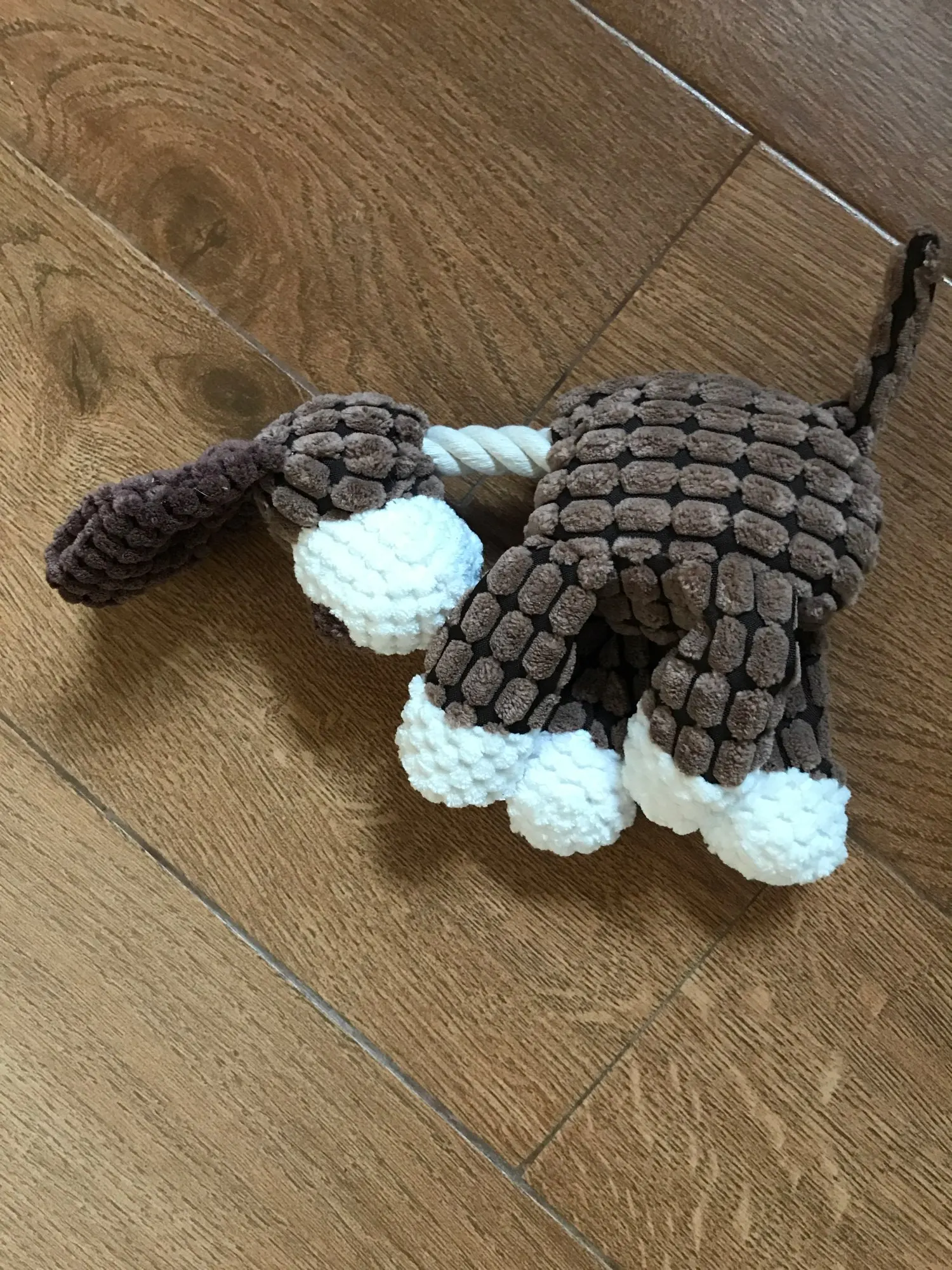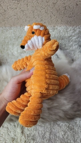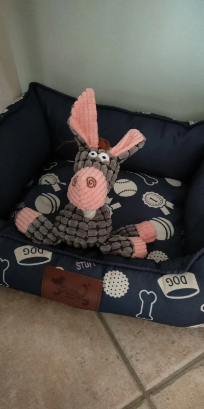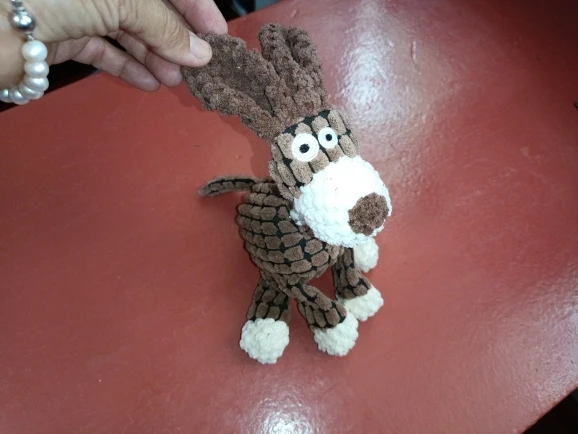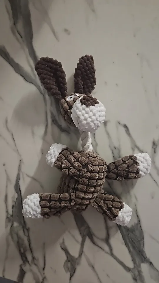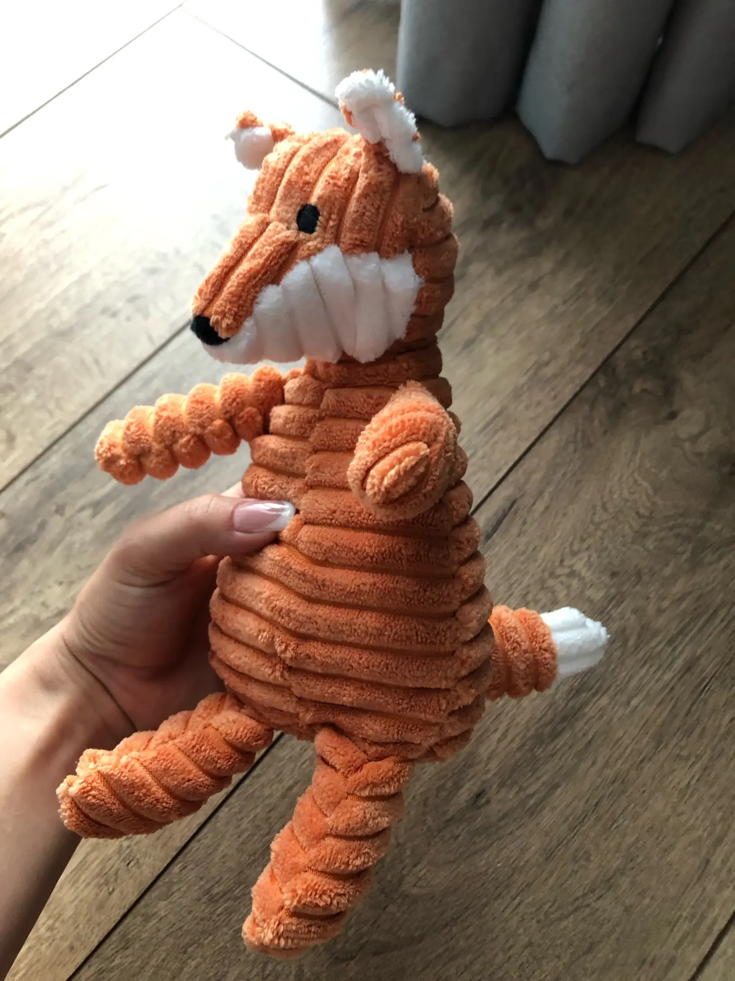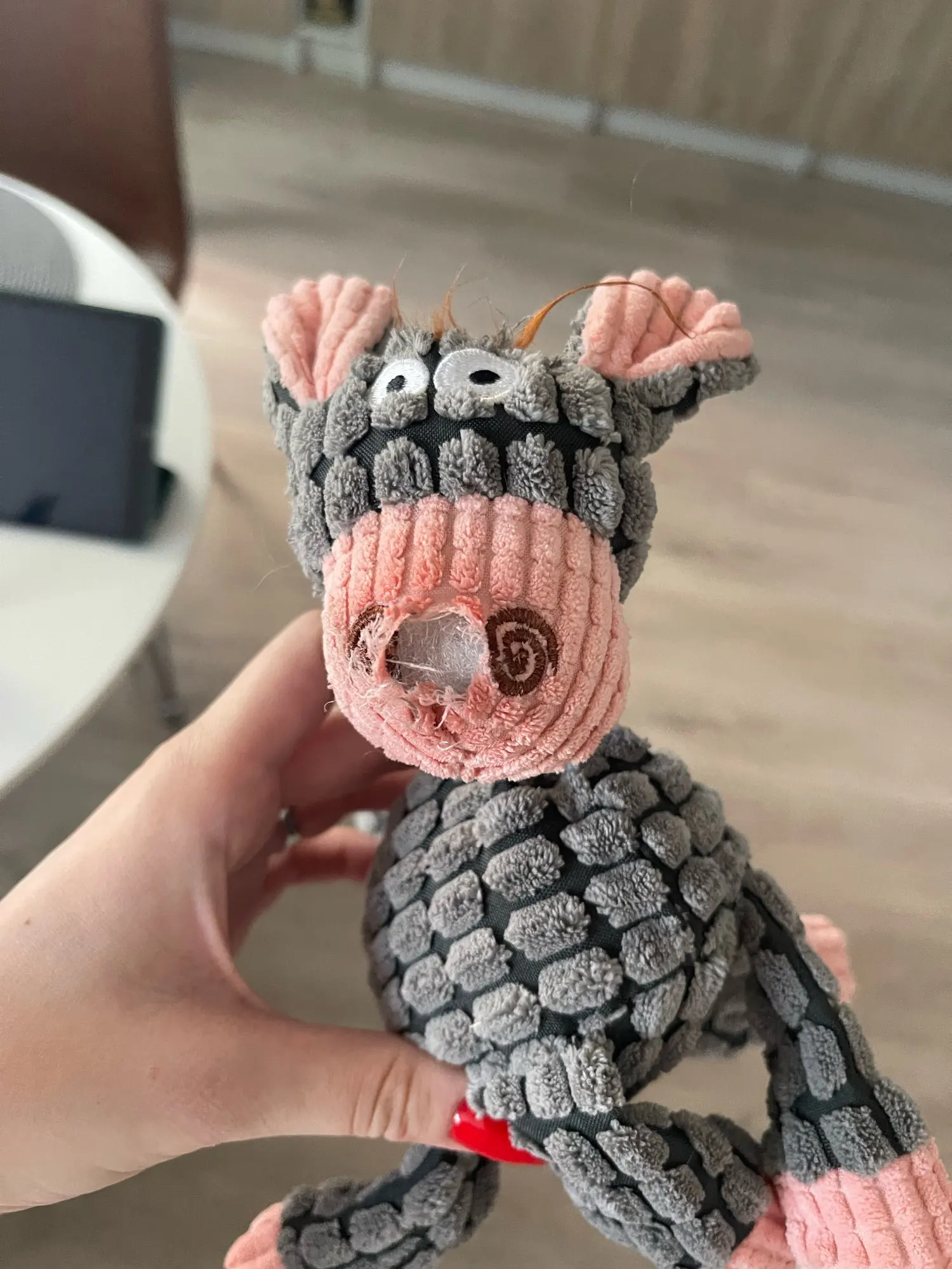 This is an adorable little toy. My squeaker doesn’t work very well but I still like it. My daughter’s furbabies are gonna love it. It is a soft toy but the head is held on with a rope for the dogs to chew on or to play tug of war. Really cute toy.