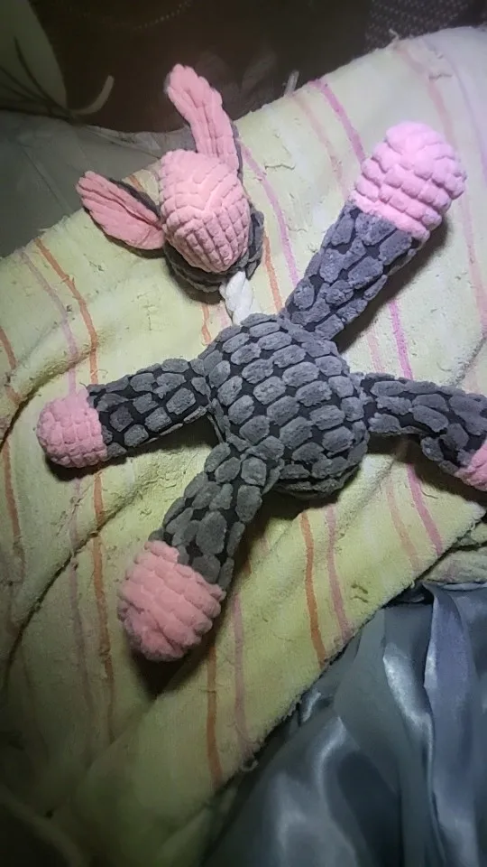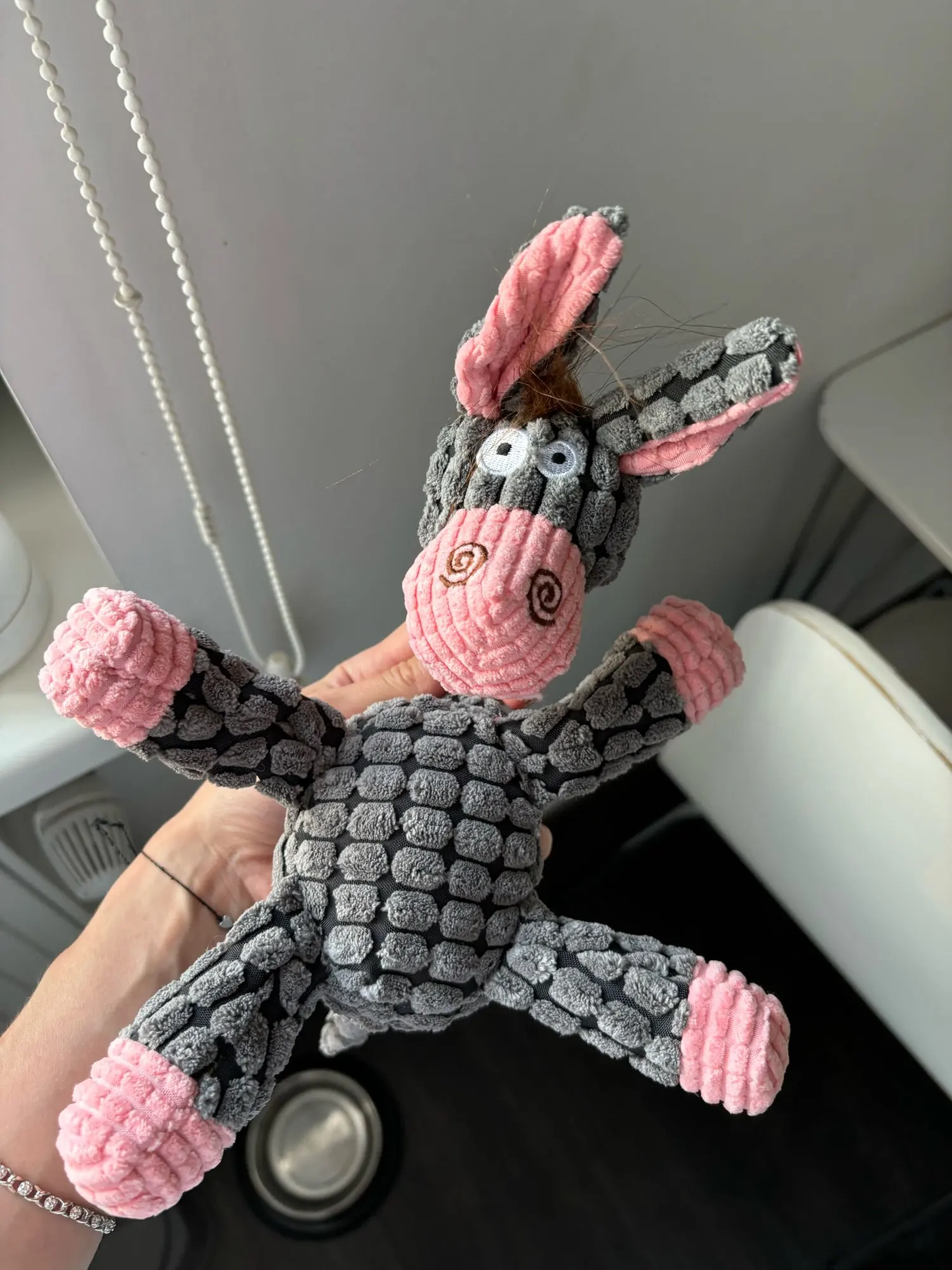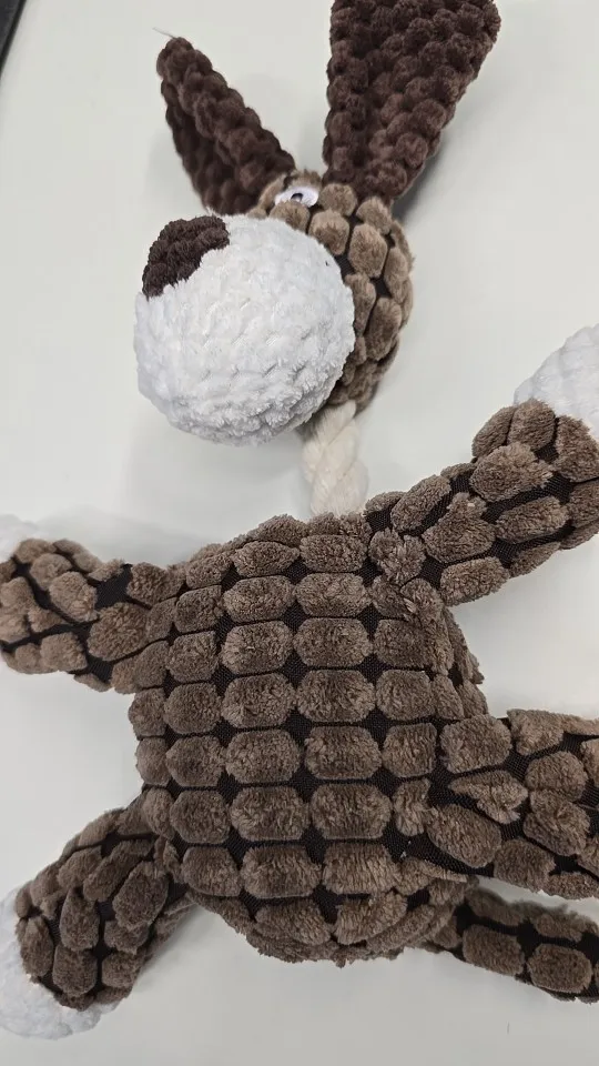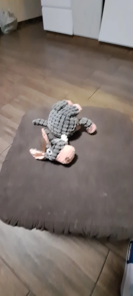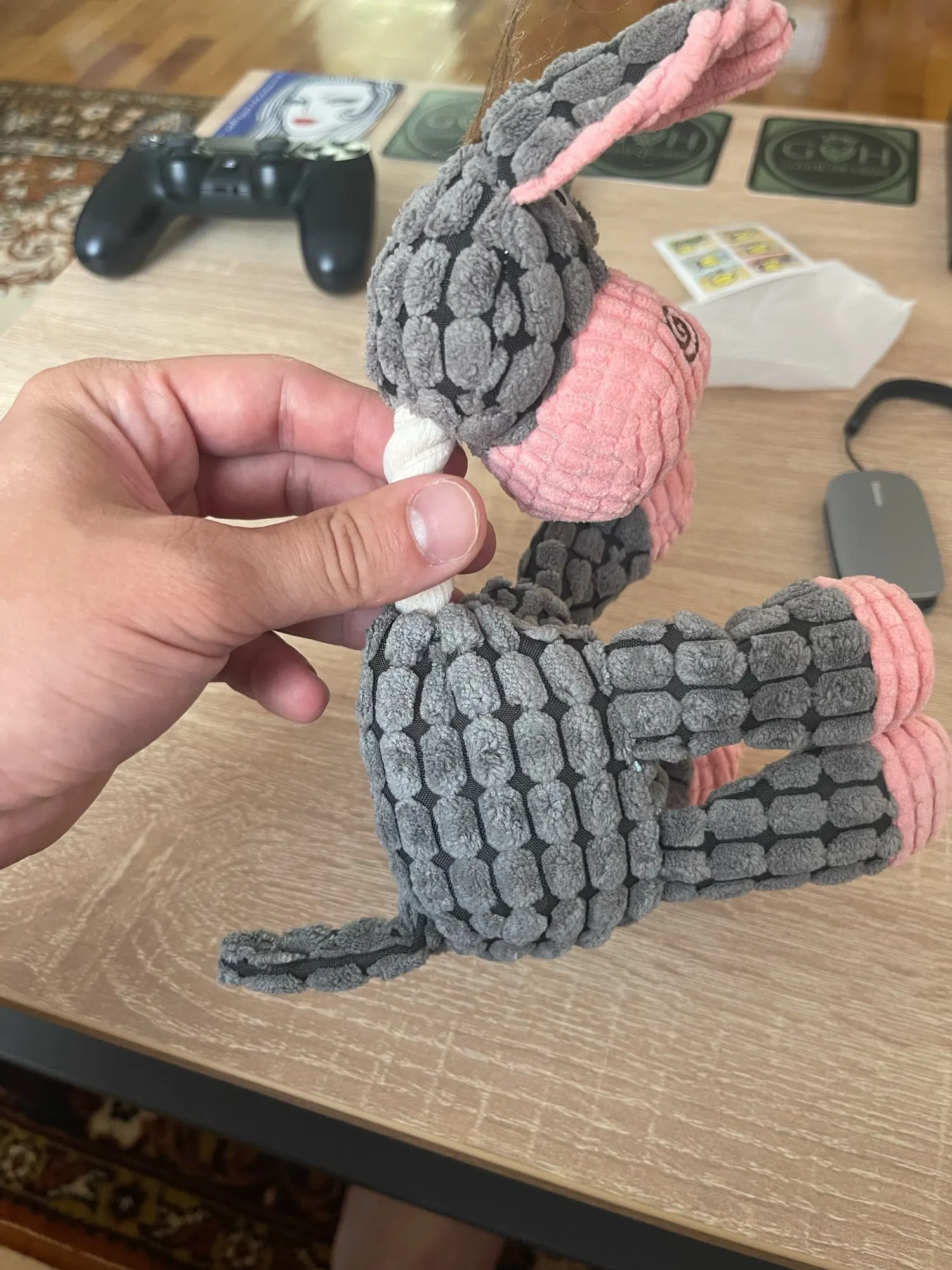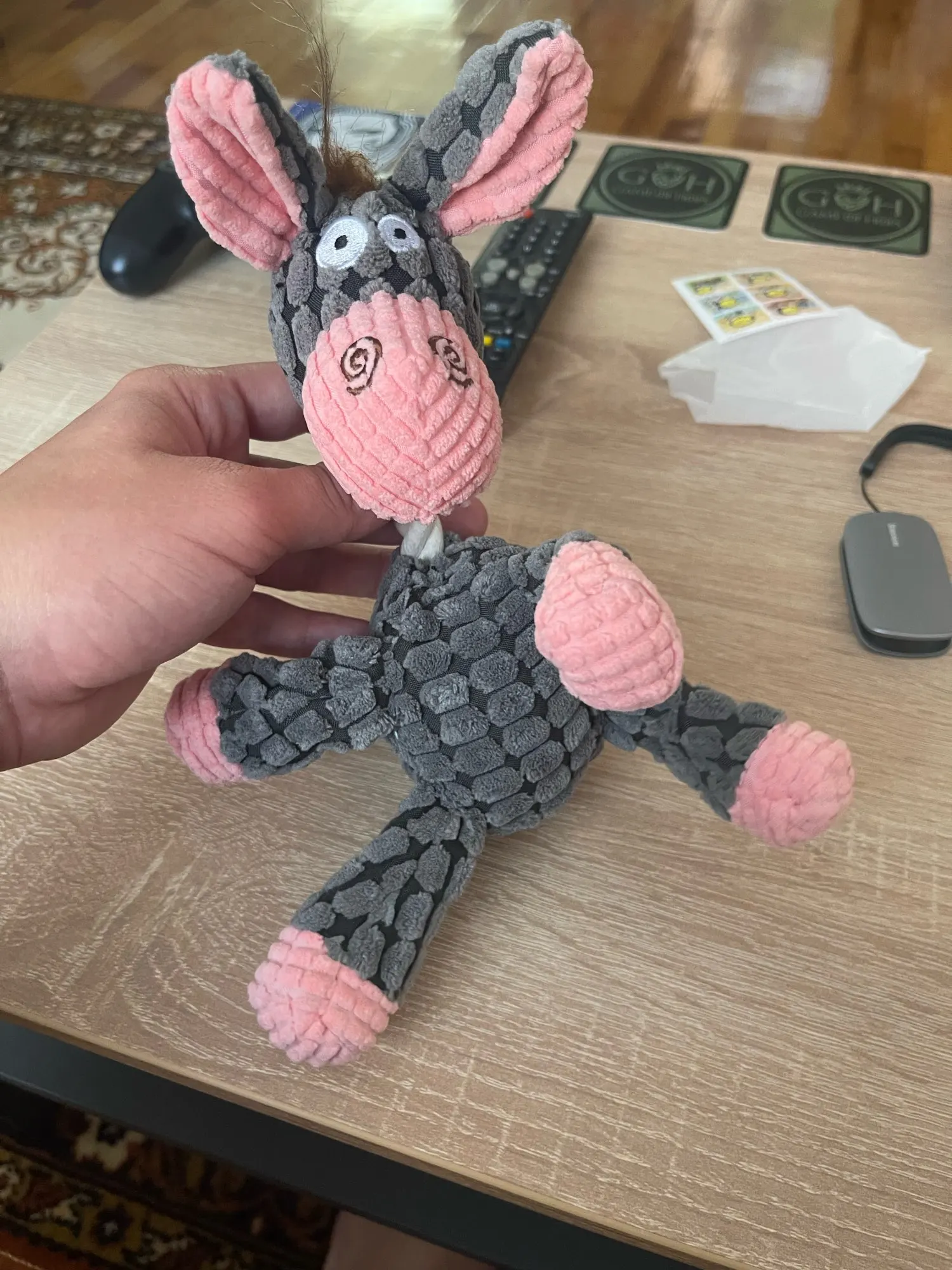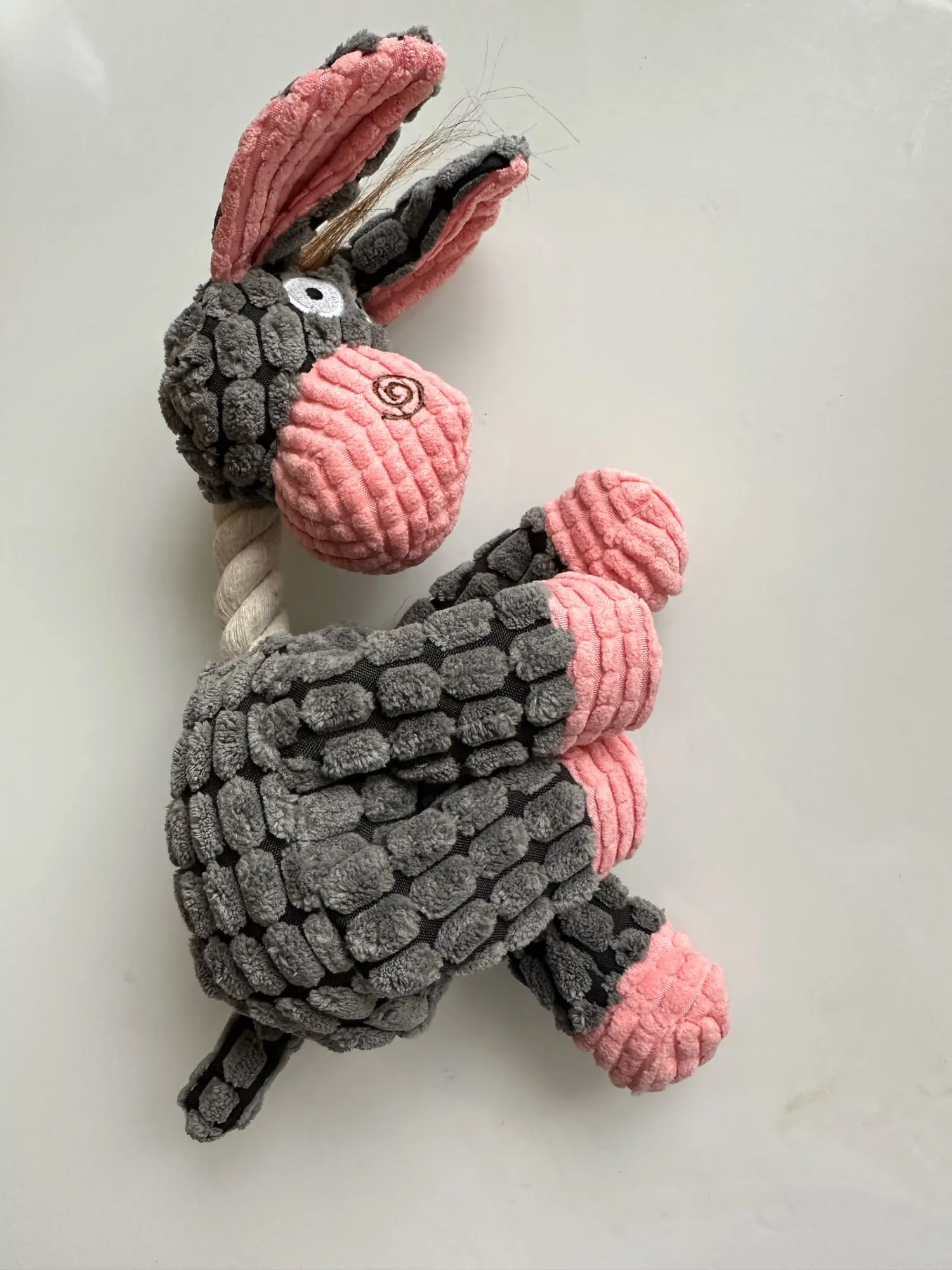 This is an adorable little toy. My squeaker doesn’t work very well but I still like it. My daughter’s furbabies are gonna love it. It is a soft toy but the head is held on with a rope for the dogs to chew on or to play tug of war. Really cute toy.