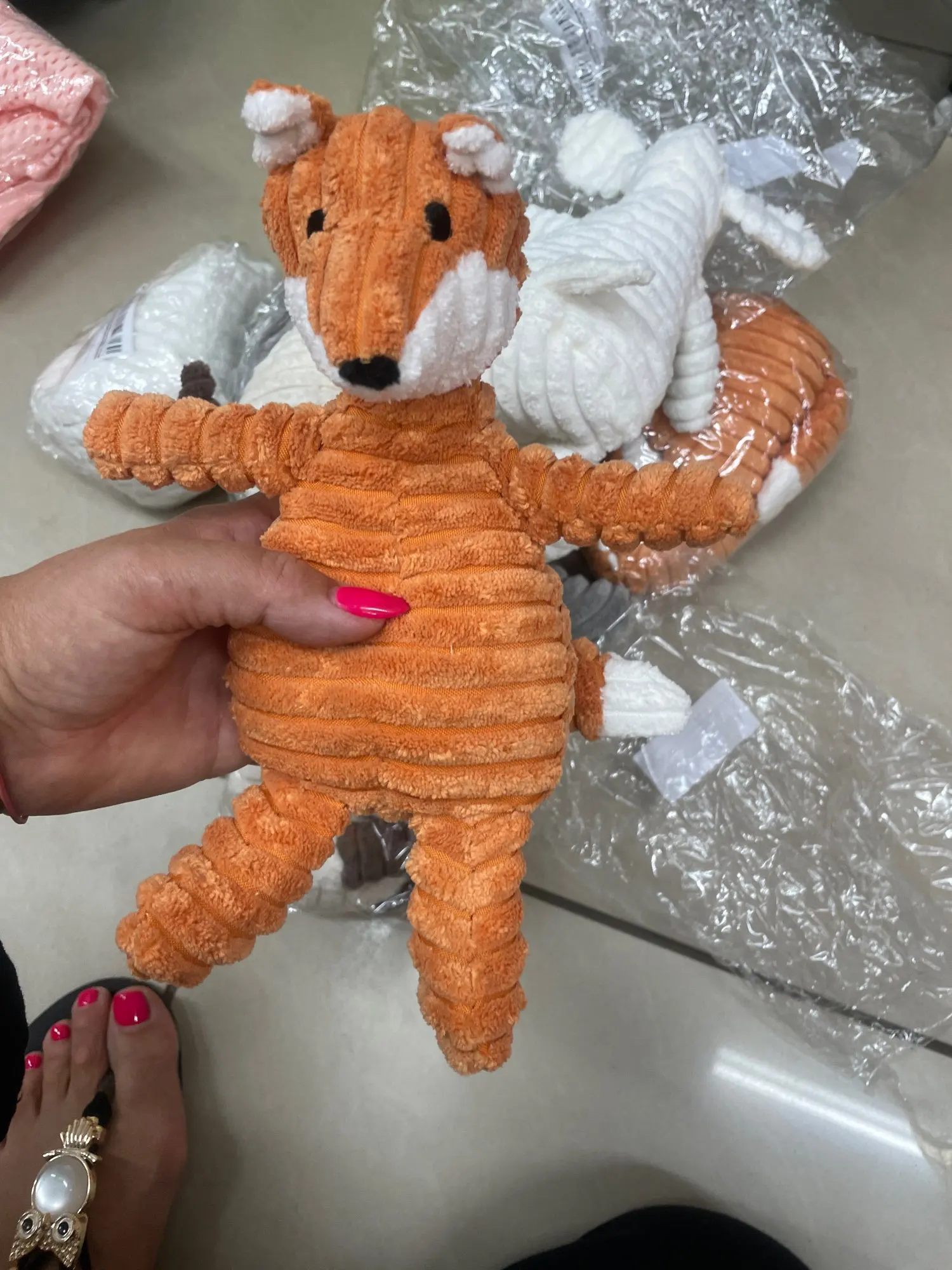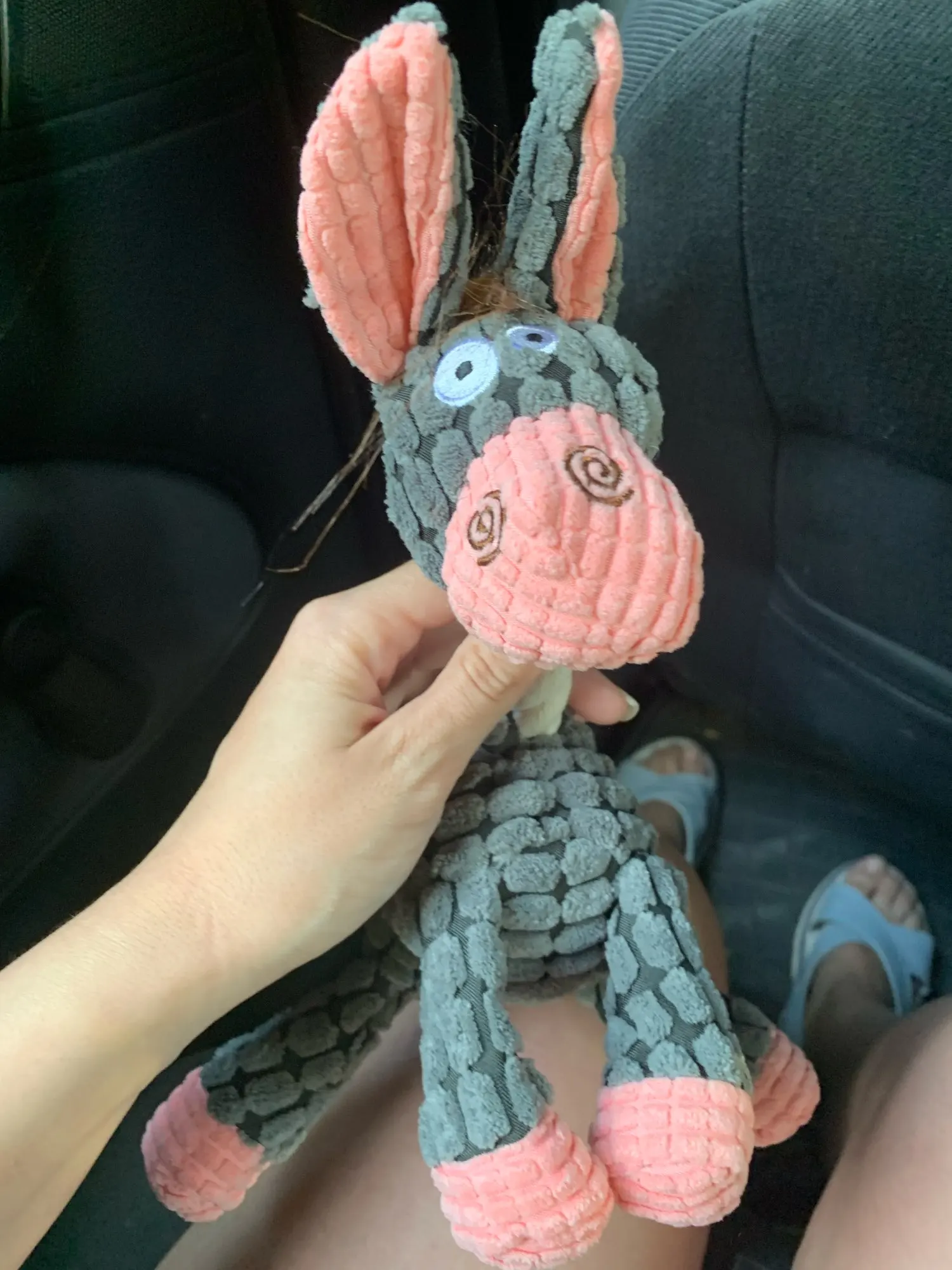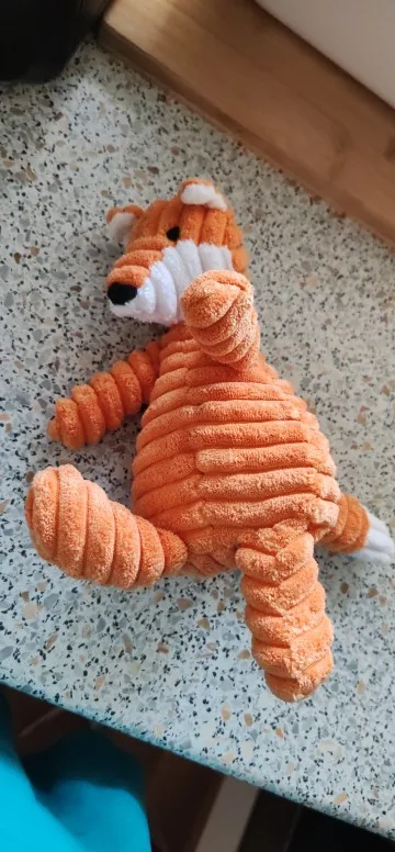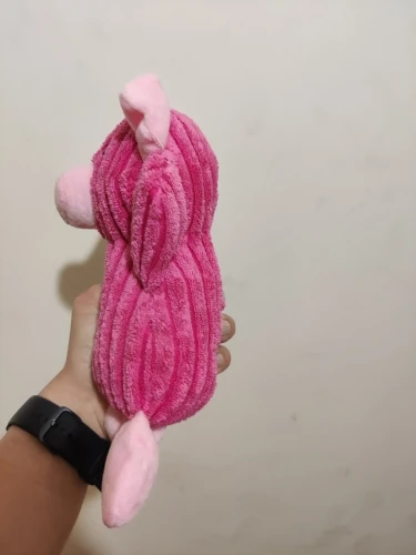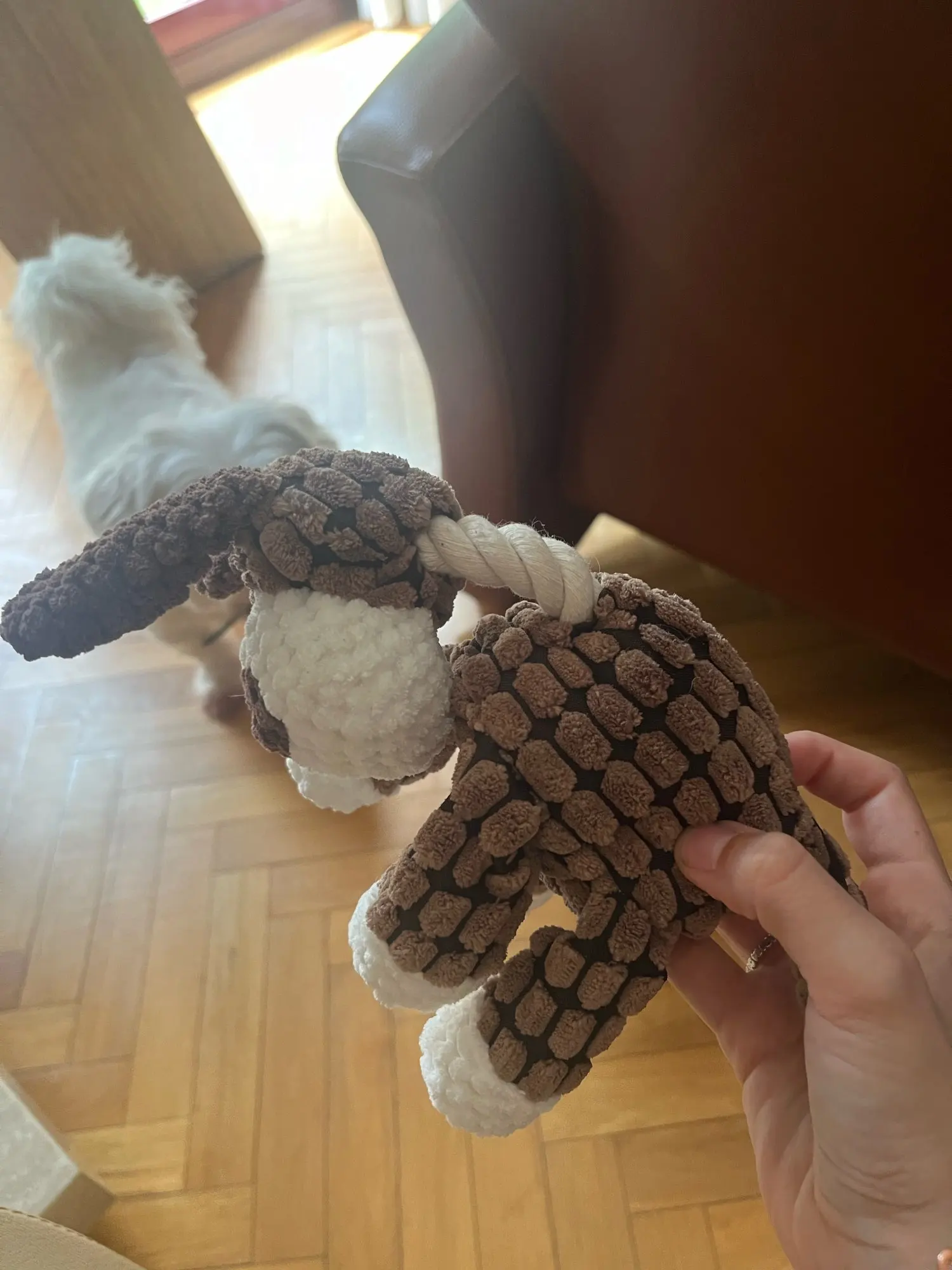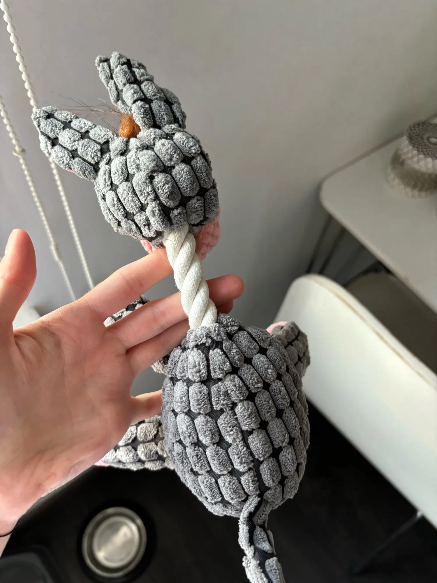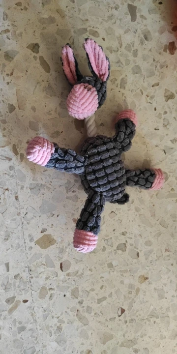 This is an adorable little toy. My squeaker doesn’t work very well but I still like it. My daughter’s furbabies are gonna love it. It is a soft toy but the head is held on with a rope for the dogs to chew on or to play tug of war. Really cute toy.