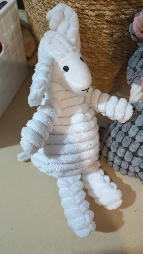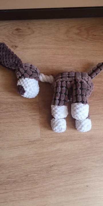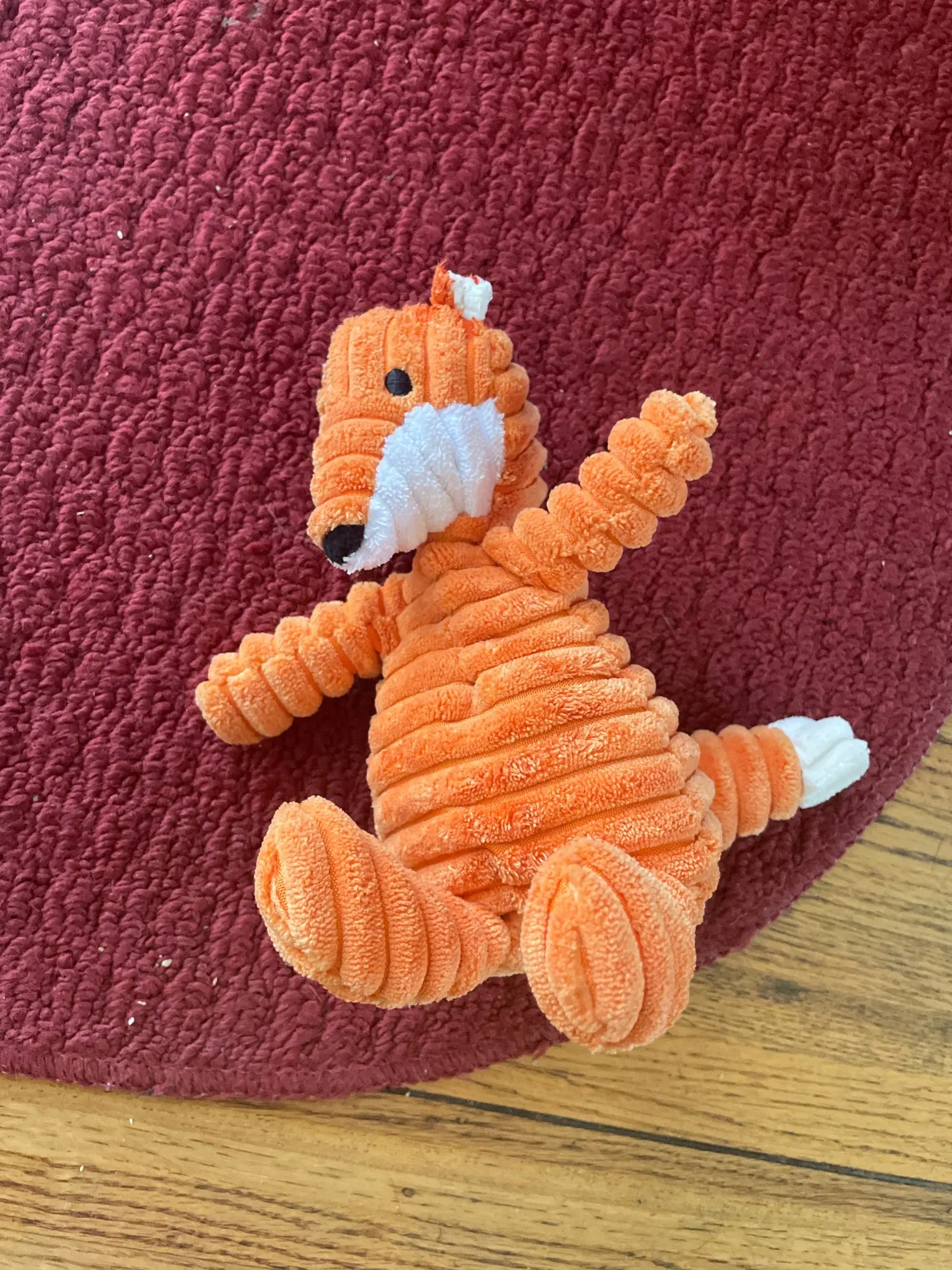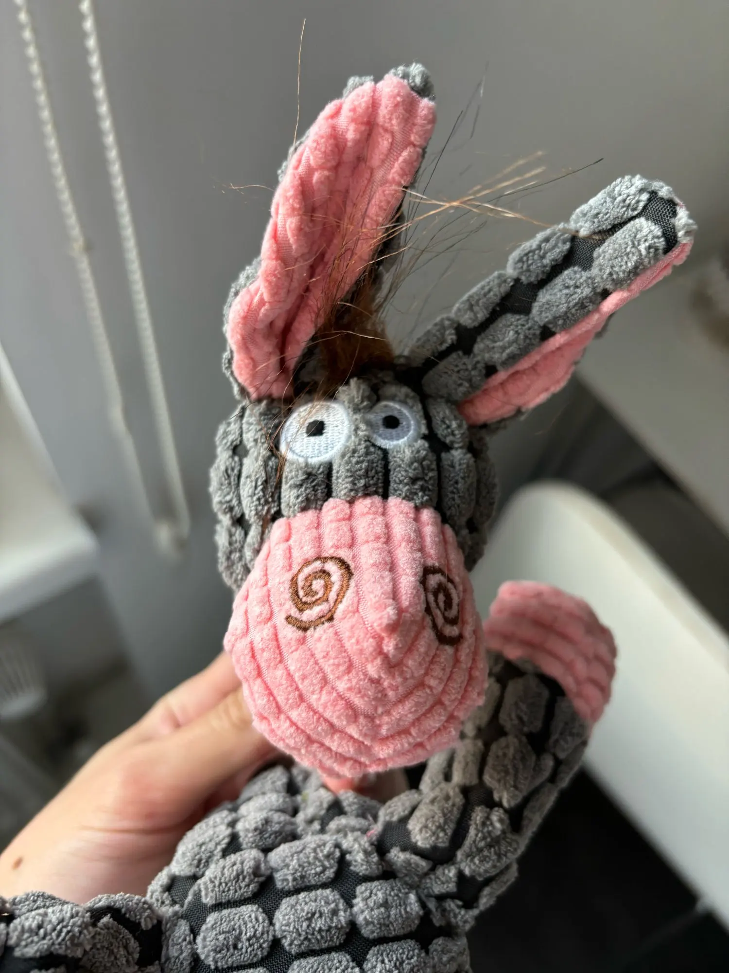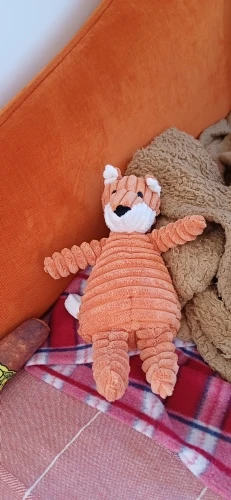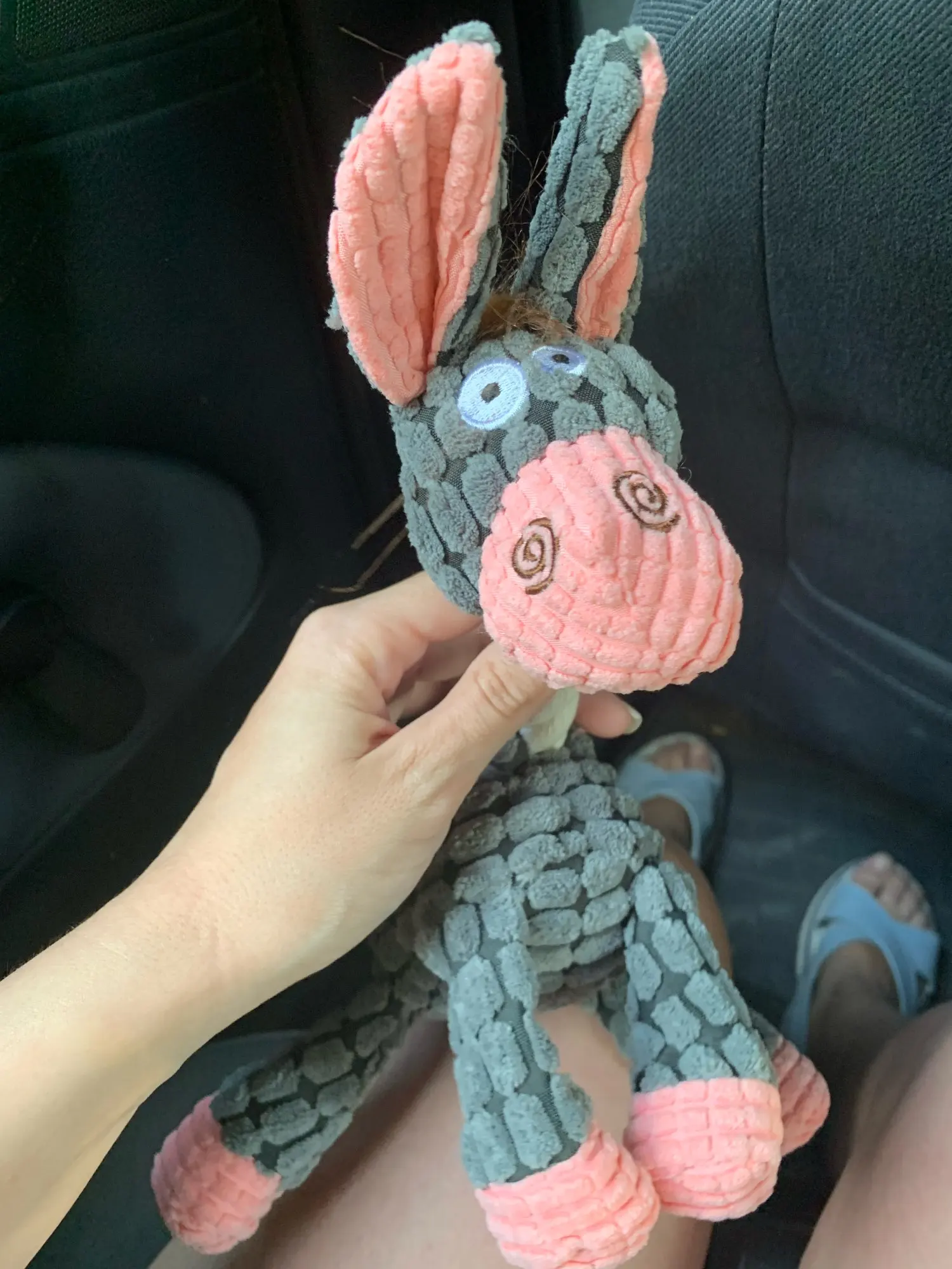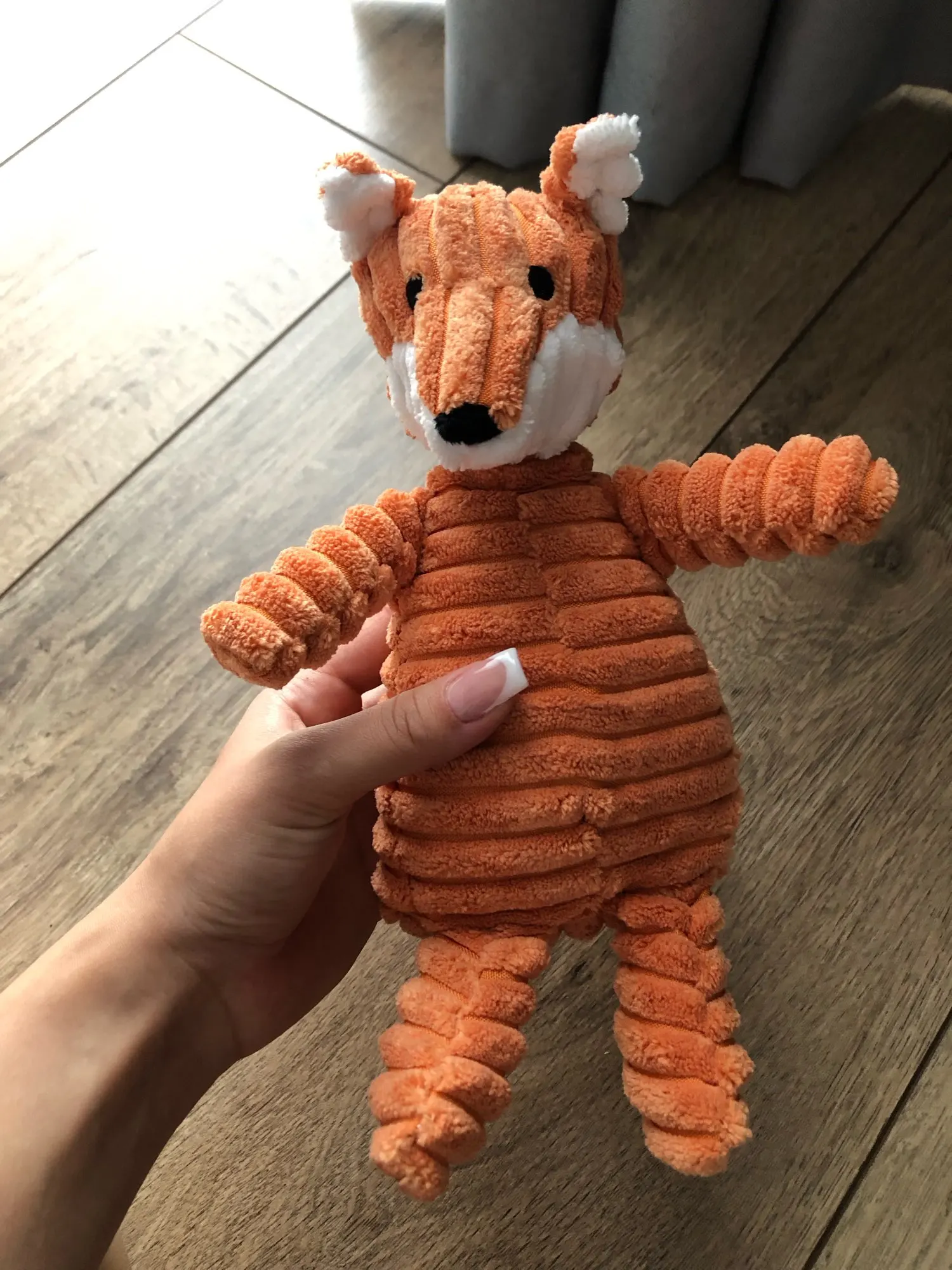 This is an adorable little toy. My squeaker doesn’t work very well but I still like it. My daughter’s furbabies are gonna love it. It is a soft toy but the head is held on with a rope for the dogs to chew on or to play tug of war. Really cute toy.