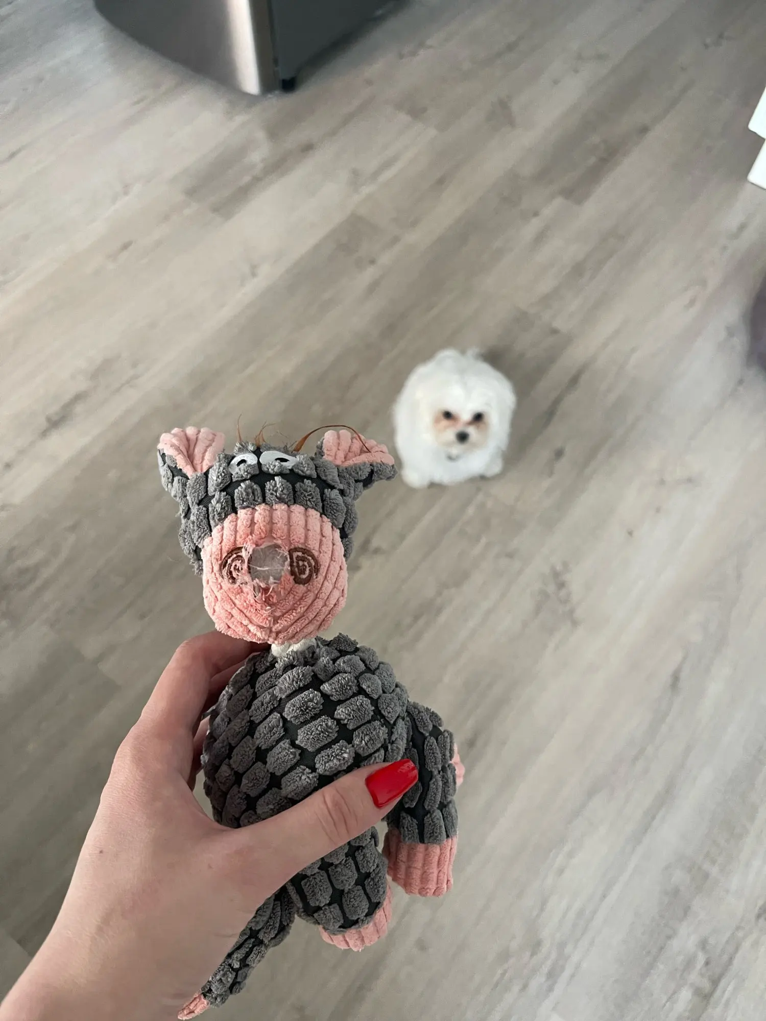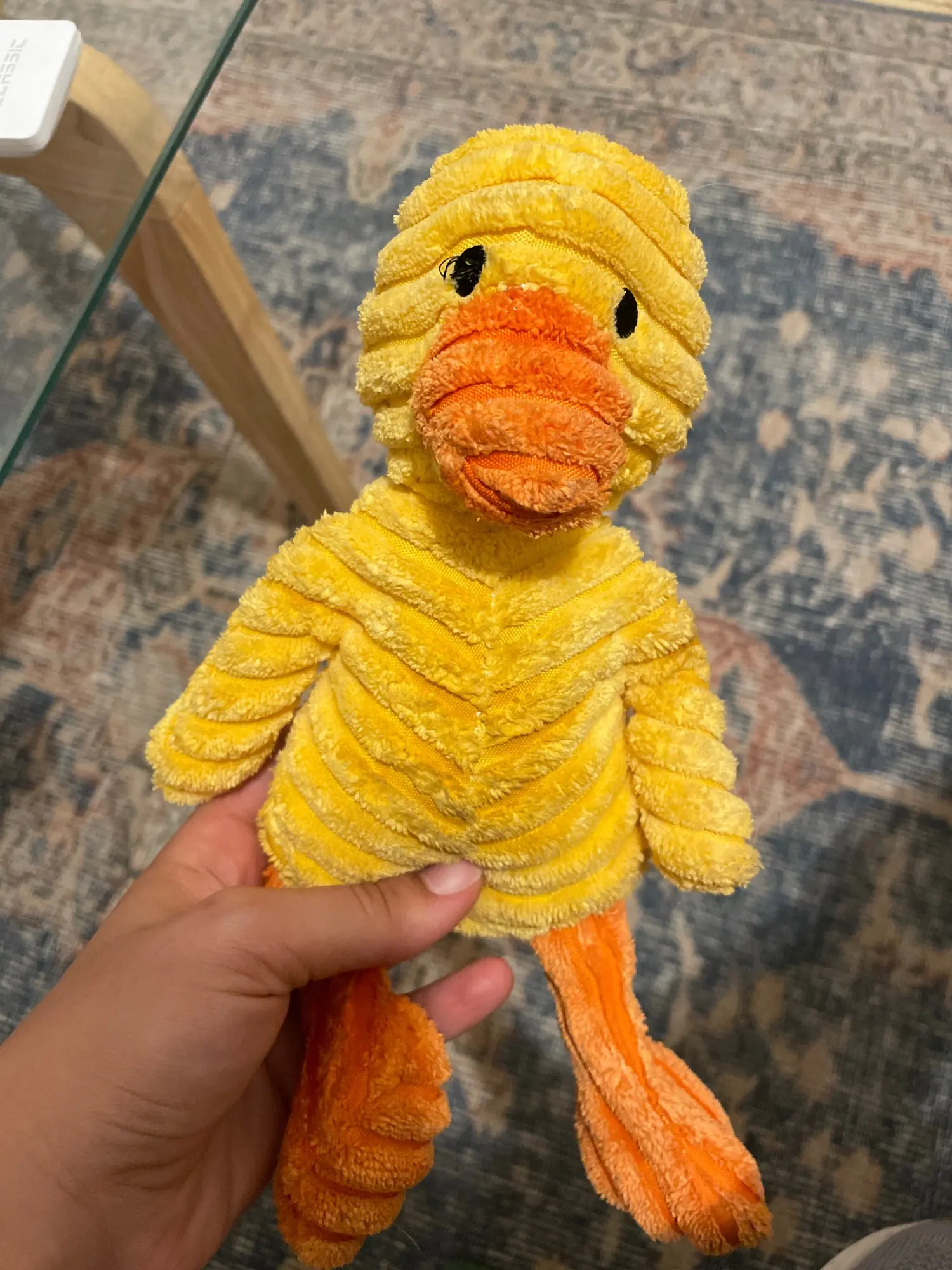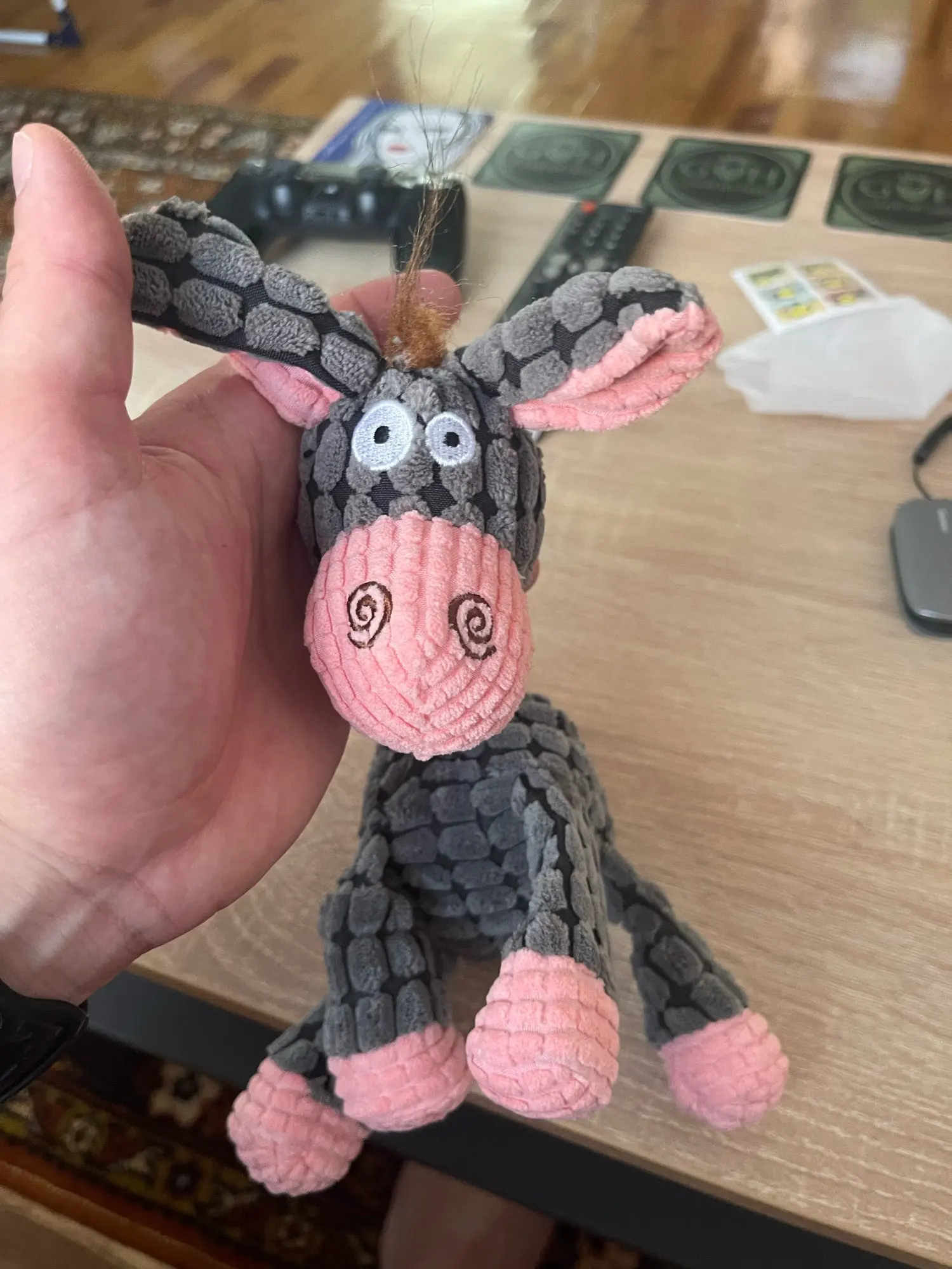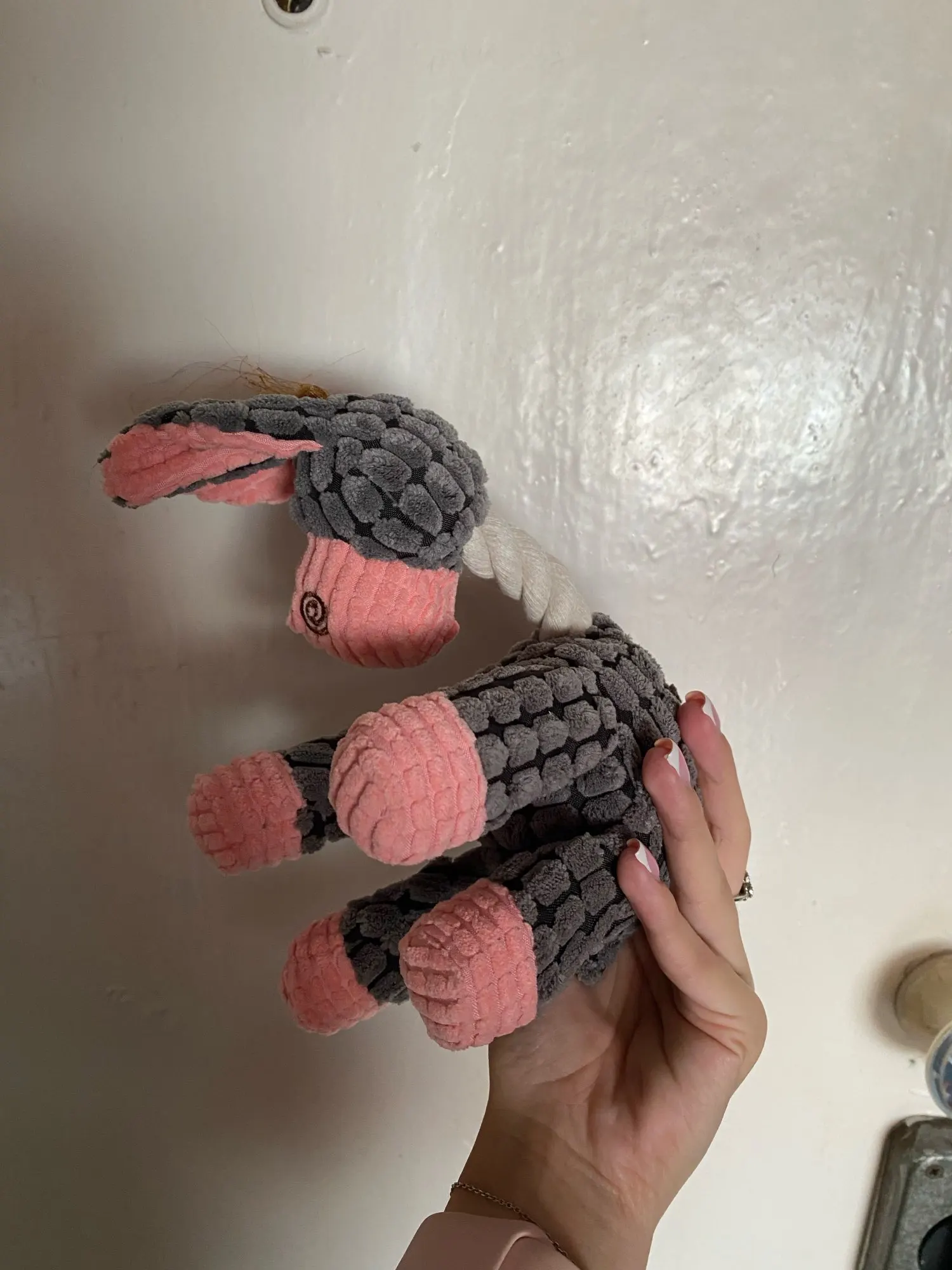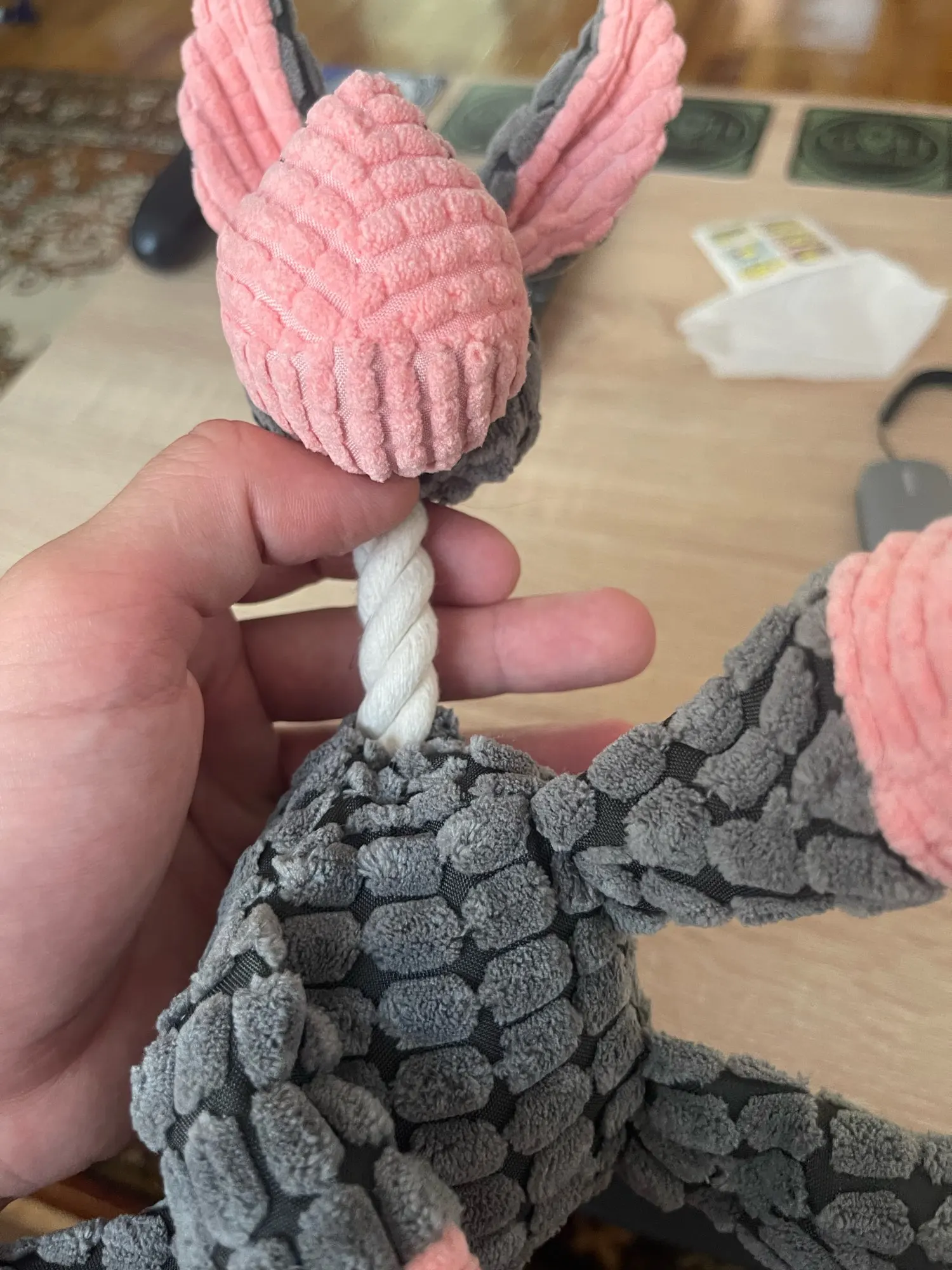 This is an adorable little toy. My squeaker doesn’t work very well but I still like it. My daughter’s furbabies are gonna love it. It is a soft toy but the head is held on with a rope for the dogs to chew on or to play tug of war. Really cute toy.