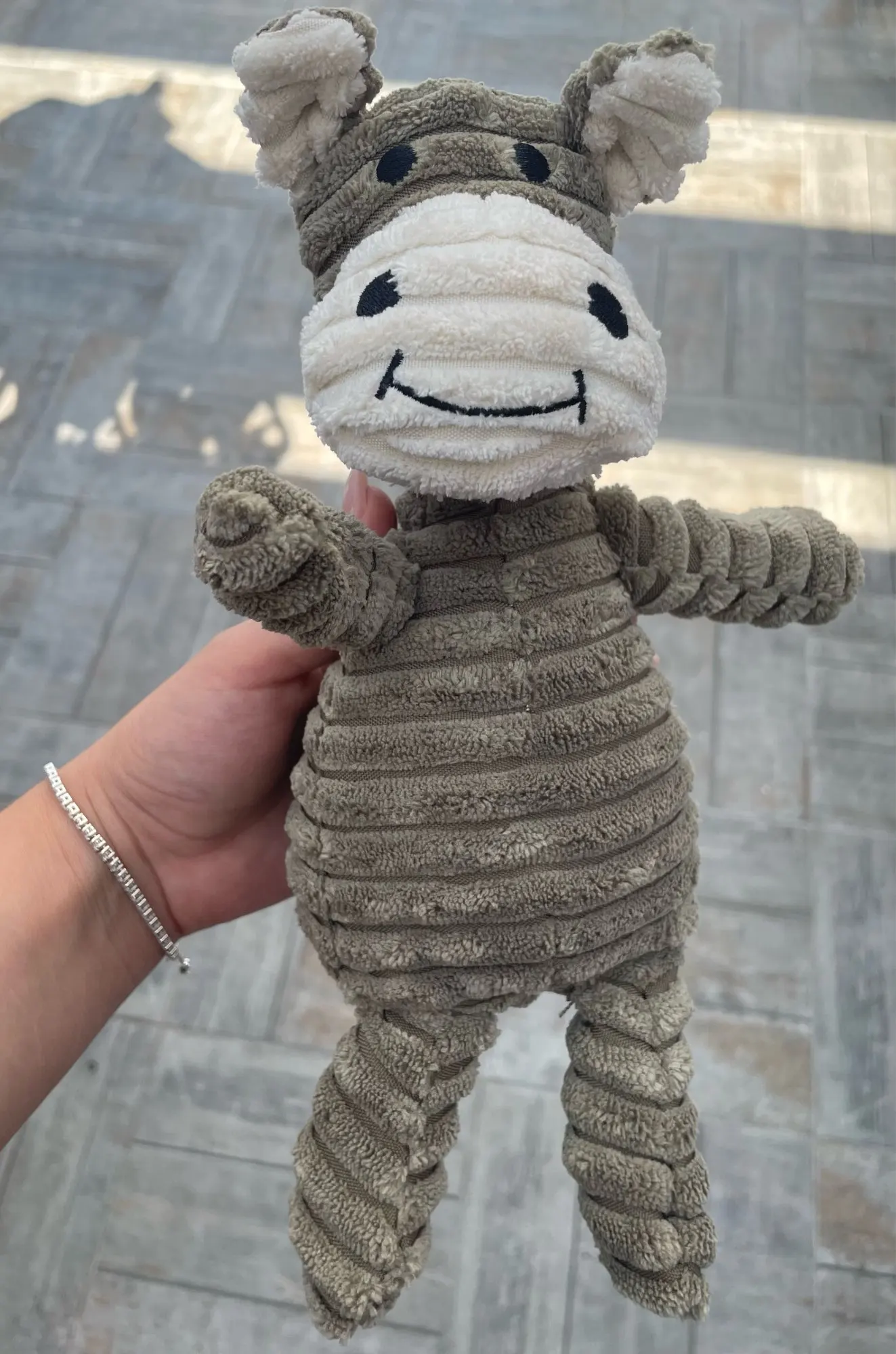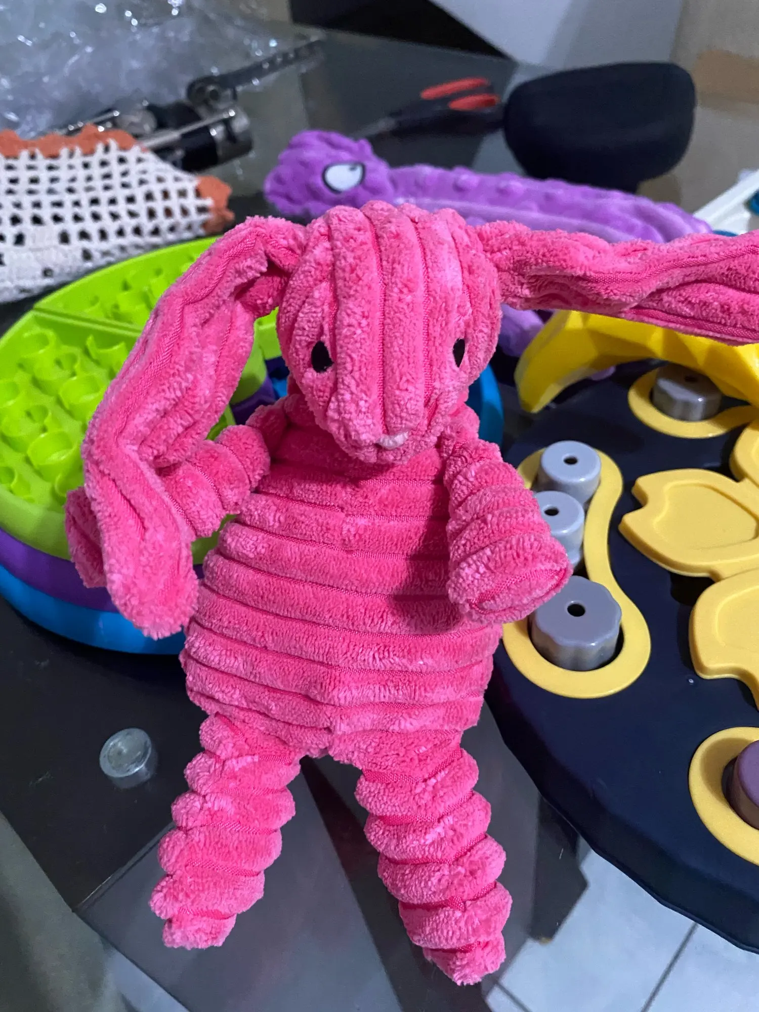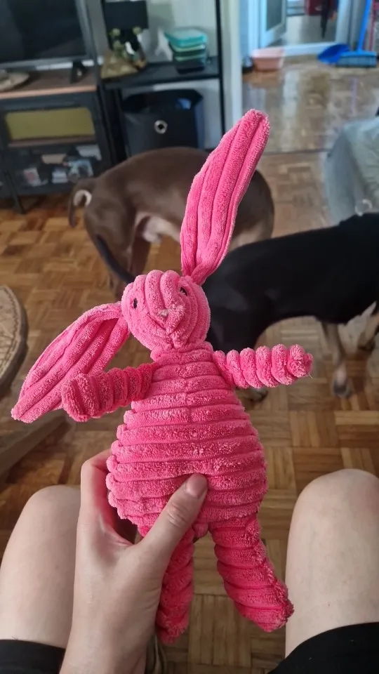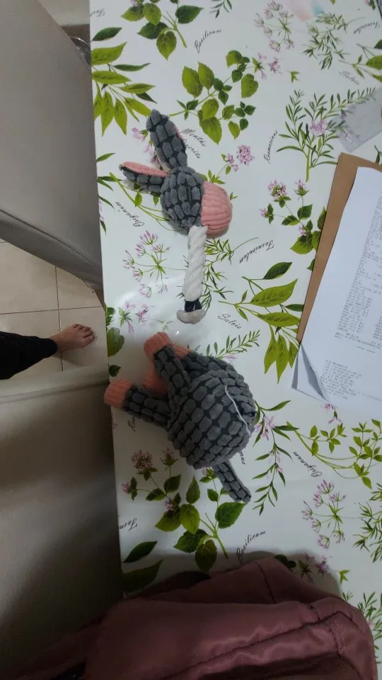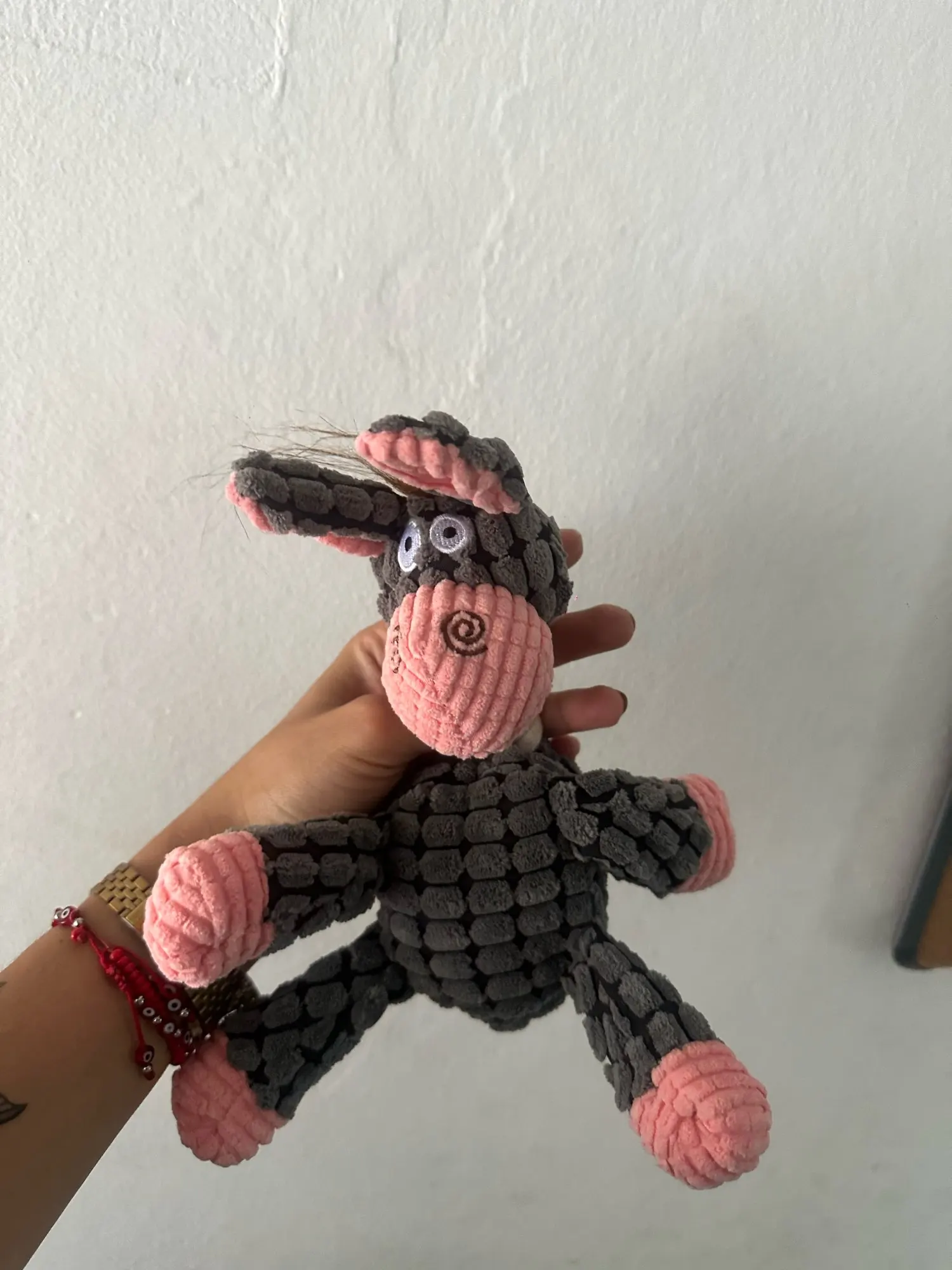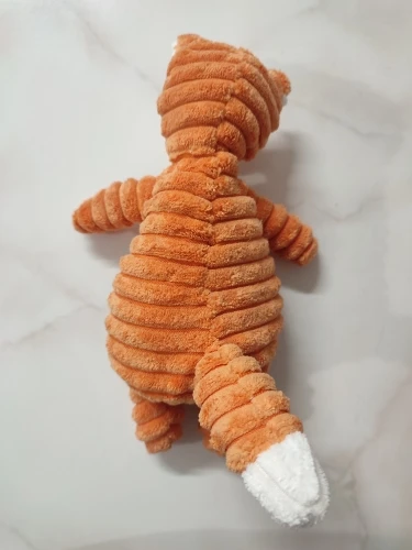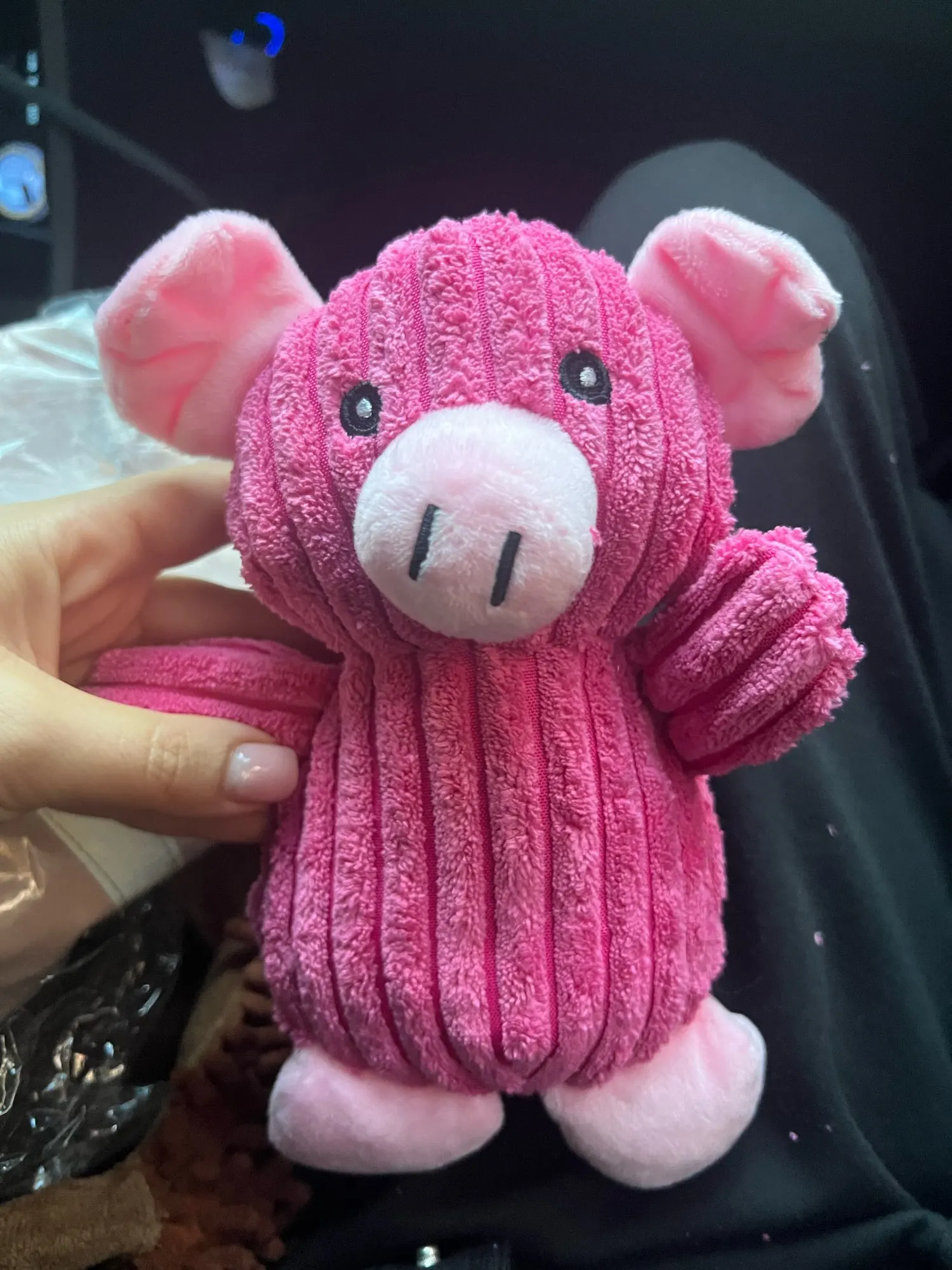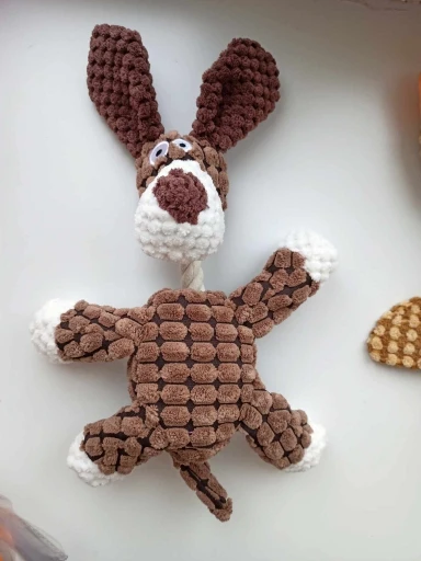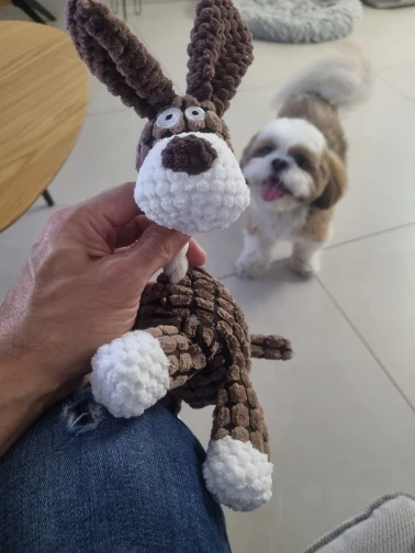 This is an adorable little toy. My squeaker doesn’t work very well but I still like it. My daughter’s furbabies are gonna love it. It is a soft toy but the head is held on with a rope for the dogs to chew on or to play tug of war. Really cute toy.