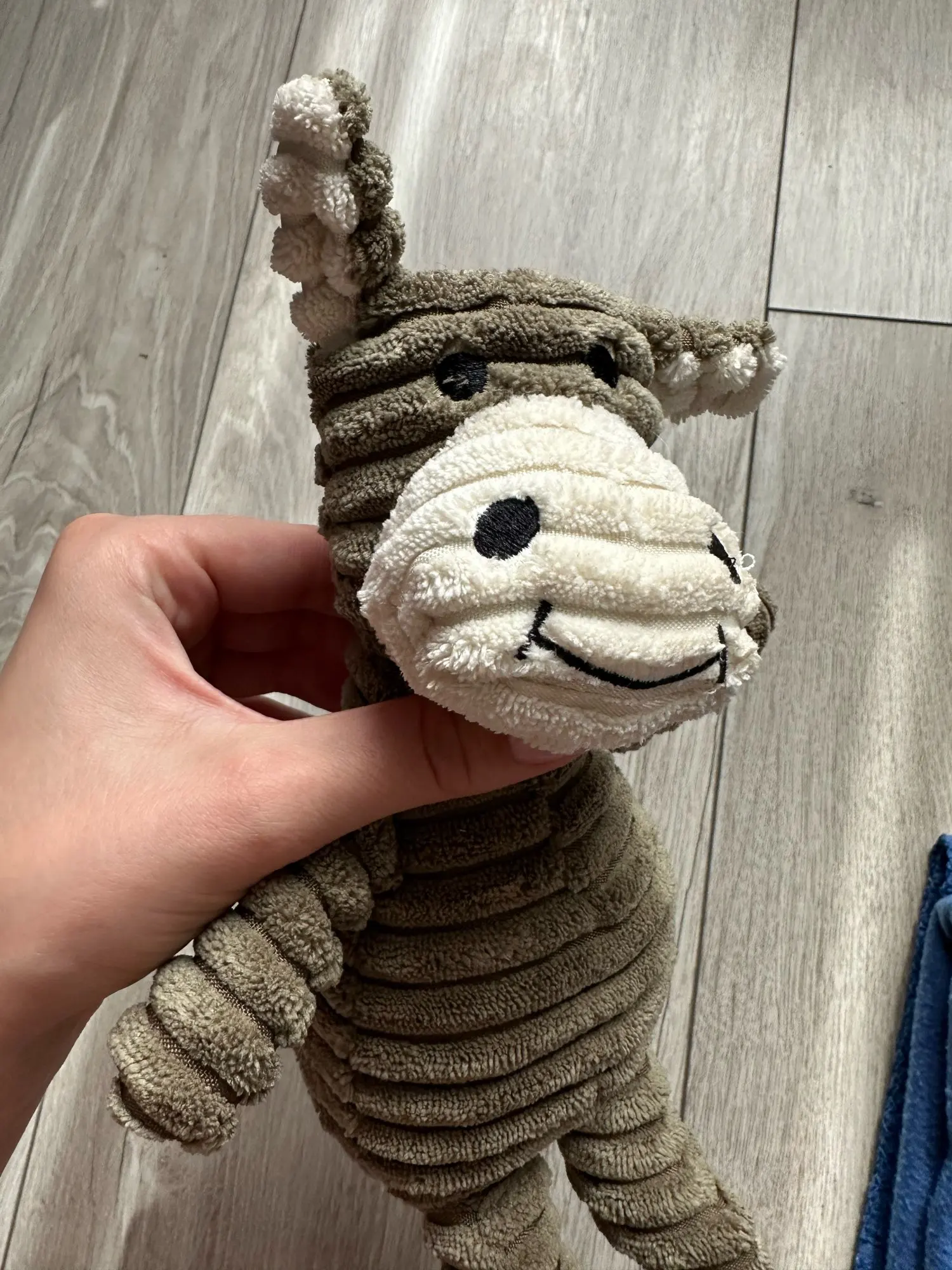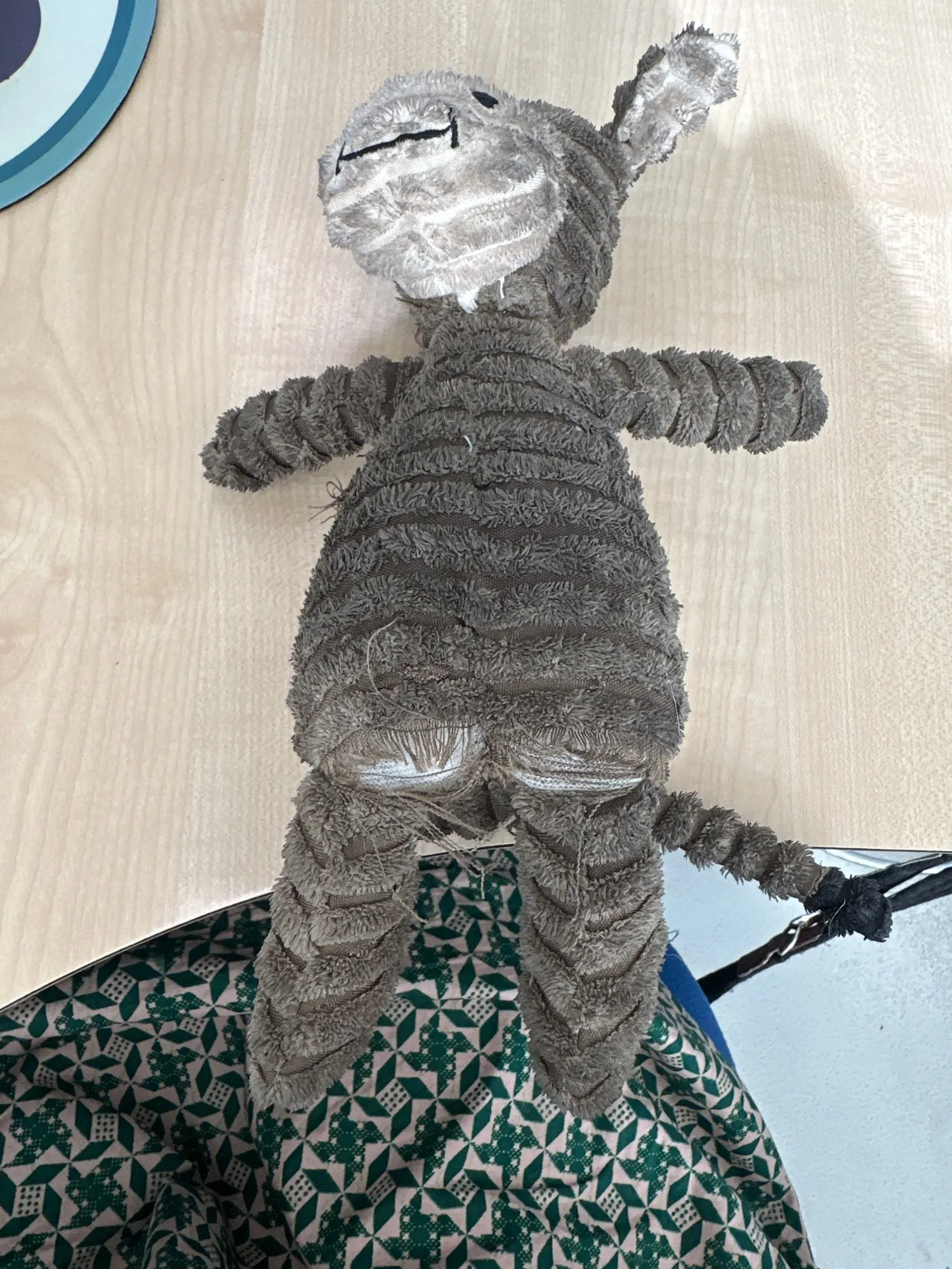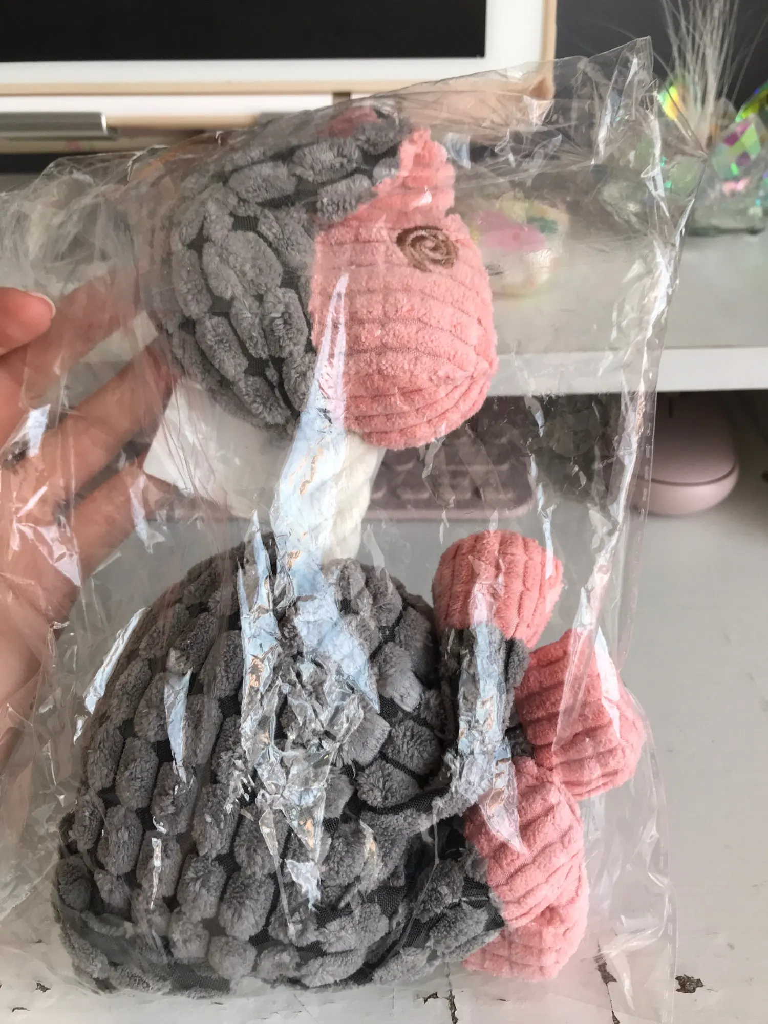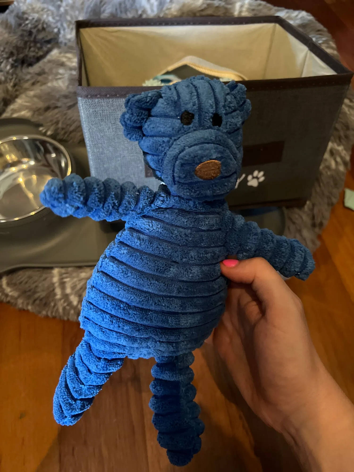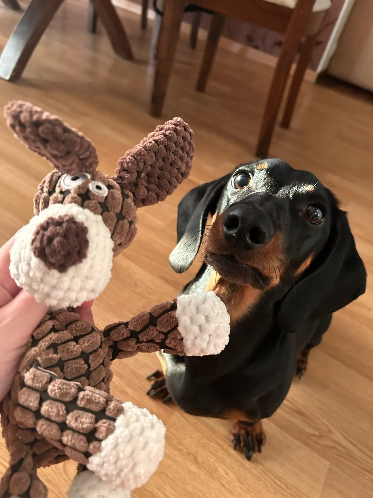 This is an adorable little toy. My squeaker doesn’t work very well but I still like it. My daughter’s furbabies are gonna love it. It is a soft toy but the head is held on with a rope for the dogs to chew on or to play tug of war. Really cute toy.
