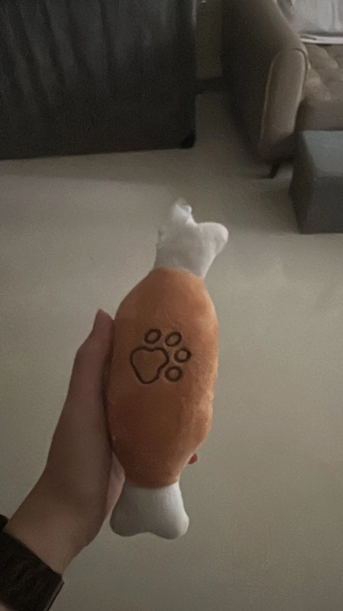 Very cute, smaller than expected, would suit puppy’s or smaller dogs. Has a squeaky toy inside and feels like good material that my puppy won’t easily chew through. Satisfied with this seller.